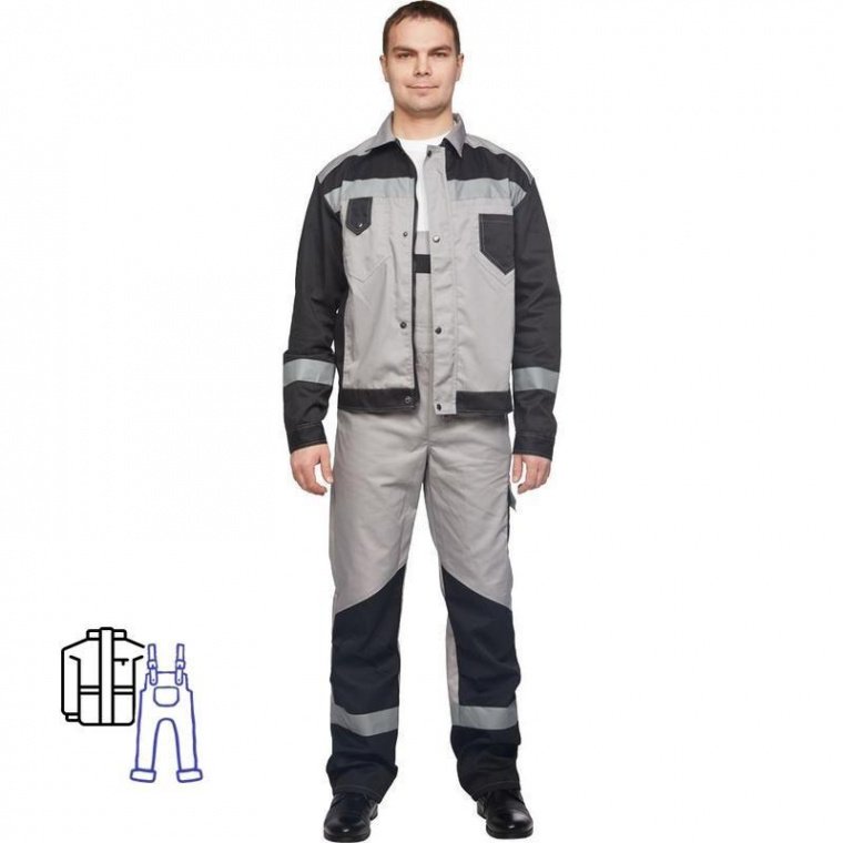 Спецодежда костюм мужской л21-КПК состоит из куртки и полукомбинезона (размер 64-66, рост 170-176) серого цвета с черными вставками. Изготовлен из смесовой ткани (65% — полиэстер, 35% — хлопок) плотностью 240 г/кв.м. Светоотражающая полоса шириной 50 мм размещена на груди, спине, рукавах, а также внизу полукомбинезона. Куртка c застежкой на молнию и кнопки. На куртке два верхних накладных кармана. Рукава с налокотниками и манжетами. Ширина пояса куртки регулируется кнопками. Полукомбинезон прямого силуэта с застежкой на пуговицы. На передней половине полукомбинезона расположены два накладных кармана со скошенным входом, а также один верхний накладной карман. На полукомбинезоне сзади 2 накладных кармана, один из которых на кнопке, а также боковой накладной карман на кнопке. Костюм предназначен для защиты от общих производственных загрязнений и механических воздействий. ГОСТ 27575-87.