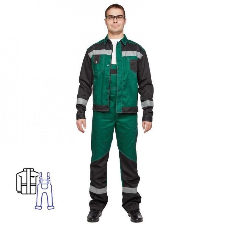 Спецодежда костюм мужской л21-КПК состоит из куртки и полукомбинезона (размер 44-46, рост 170-176) зеленого цвета с черными вставками. Изготовлен из смесовой ткани (65% — полиэстер, 35% — хлопок) плотностью 240 г/кв.м. Светоотражающая полоса шириной 50 мм размещена на груди, спине, рукавах, а также внизу полукомбинезона. Куртка c застежкой на молнию и кнопки. На куртке два верхних накладных кармана. Рукава с налокотниками и манжетами. Ширина пояса куртки регулируется кнопками. Полукомбинезон прямого силуэта с застежкой на пуговицы. На передней половине полукомбинезона расположены два накладных кармана со скошенным входом, а также один верхний накладной карман. На полукомбинезоне сзади 2 накладных кармана, один из которых на кнопке, а также боковой накладной карман на кнопке. Костюм предназначен для защиты от общих производственных загрязнений и механических воздействий. ГОСТ 27575-87.