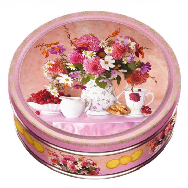 Круглая металлическая банка с изображением чарующего летнего натюрморта с яркими и ароматными цветами невольно привлекает взгляд и отлично вписывается в интерьер. Элегантная упаковка делает сдобное печенье замечательным подарком для партнеров, коллег, друзей и родных, которую можно преподнести в паре с чаем и кофе на профессиональные и личные праздники. Наслаждайтесь прекрасным печеньем сами и угощайте других.
