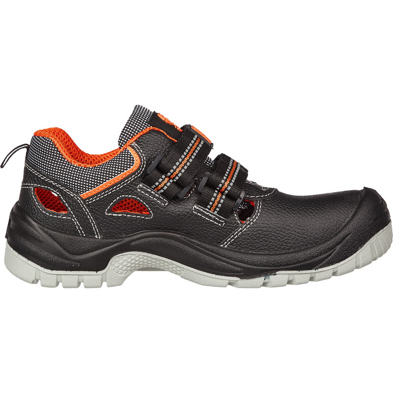Сандалии Премиум 1303ПК черного цвета выполнены из натуральной кожи. Подошва антистатичная, маслобензостойкая, противоскользящая, двухслойная: полиуретан и термополиуретан. Промежуточный слой из полиуретана обладает амортизирующими свойствами, гасит ударные нагрузки, а также придает обуви легкость, комфортность и повышенные теплозащитные свойства. Ходовой слой изготовлен из износостойкого термопластичного полиуретана ТПУ с улучшенным сопротивлением скольжению, обладающего стойкостью к деформациям и стиранию. Изготовлены без применения металлической фурнитуры, что позволяет применять эту модель в энергетической промышленности и на работах, предусматривающих прохождение работников через металлодетекторы. Перфорация обеспечивает воздухообмен и комфорт во время носки. Фиксируются на стопе при помощи ремней с контактной лентой велькро. Объемная колодка специальной конструкции дает возможность работать целый день, не испытывая дискомфорта и усталости. Метод крепления подошвы: литьевой. Подносок: композитный (поликарбонатный), защищает от ударов силой до 200 Дж.