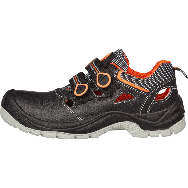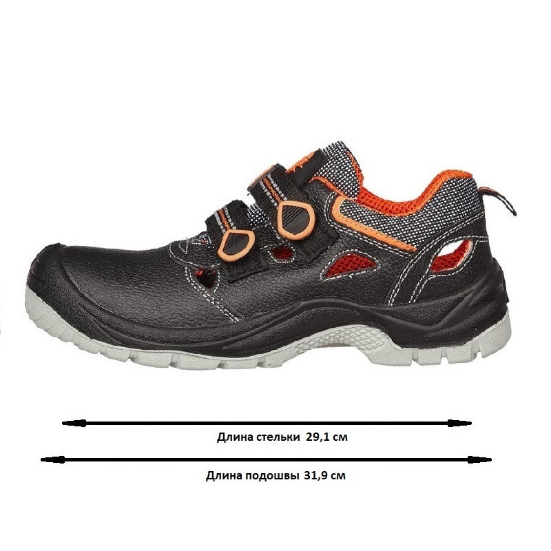 Сандалии Премиум 1303ПК черного цвета выполнены из натуральной кожи. Подошва антистатичная, маслобензостойкая, противоскользящая, двухслойная: полиуретан и термополиуретан. Промежуточный слой из полиуретана обладает амортизирующими свойствами, гасит ударные нагрузки, а также придает обуви легкость, комфортность и повышенные теплозащитные свойства. Ходовой слой изготовлен из износостойкого термопластичного полиуретана ТПУ с улучшенным сопротивлением скольжению, обладающего стойкостью к деформациям и стиранию. Изготовлены без применения металлической фурнитуры, что позволяет применять эту модель в энергетической промышленности и на работах, предусматривающих прохождение работников через металлодетекторы. Перфорация обеспечивает воздухообмен и комфорт во время носки. Фиксируются на стопе при помощи ремней с контактной лентой велькро. Объемная колодка специальной конструкции дает возможность работать целый день, не испытывая дискомфорта и усталости. Метод крепления подошвы: литьевой. Подносок: композитный (поликарбонатный), защищает от ударов силой до 200 Дж.