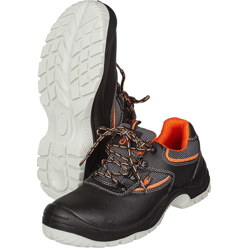 Полуботинки Премиум 1302ПК черного цвета на шнуровке выполнены из натуральной кожи. Подошва антистатичная, маслобензостойкая, противоскользящая, двухслойная: полиуретан и термополиуретан. Промежуточный слой из полиуретана обладает амортизирующими свойствами, гасит ударные нагрузки, а также придает обуви легкость, комфортность и повышенные теплозащитные свойства. Ходовой слой изготовлен из износостойкого термопластичного полиуретана ТПУ с улучшенным сопротивлением скольжению, обладающего стойкостью к деформациям и стиранию. Глухой клапан исключает попадание внутрь влаги, пыли и мелких предметов. Объемная колодка специальной конструкции дает возможность работать целый день, не испытывая дискомфорта и усталости. Метод крепления подошвы: литьевой. Подносок: композитный (поликарбонатный), защищает от ударов силой до 200 Дж.