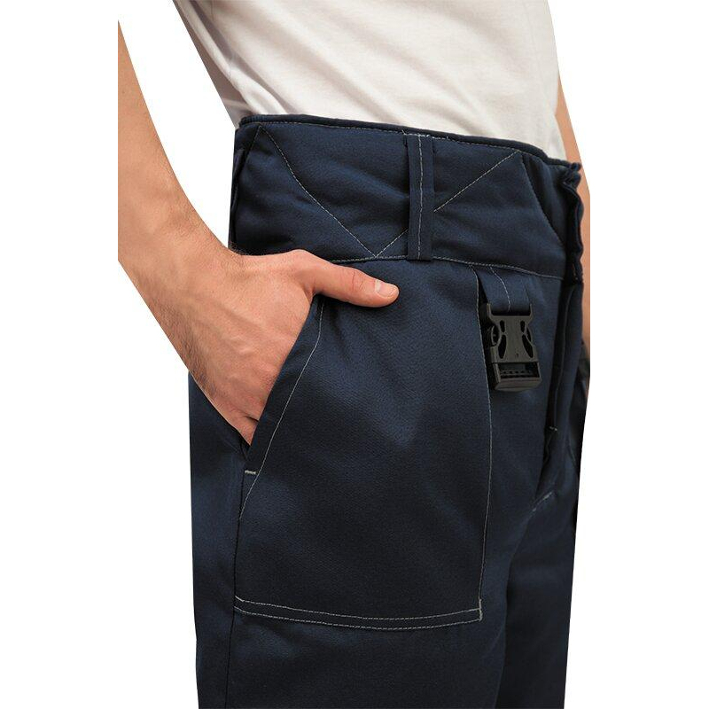 Спецодежда зимняя брюки мужские з32-БР (размер 60-62, рост 158-164) темно-синего цвета. Изготовлены из смесовой ткани (Тип 3) (80% полиэстер, 20% хлопок) плотностью 210 г/кв. м., с водоотталкивающей пропиткой. Такой материал обладает улучшенными эксплуатационными характеристиками, благодаря высокой плотности непроницаем для пыли, отличается высокой износостойкостью. Сохраняет яркий цвет. Утеплитель - синтепон, плотность утеплителя - 200 г/кв. м (1 слой). Материал подкладки - 100% полиэстер. Светоотражающая полоса шириной 5 см размещена внизу брюк. Застежка - гульф на три петли-пуговицы. Брюки прямого силуэта, с отрезным поясом. Пояс завышенный, застегивающийся на две петли-пуговицы, с пятью шлевками. Пояс стеганый на бретелях с регулировкой фастексами. Передняя часть брюк: два накладных кармана с косым входом. Понизу кармана двойная отсрочка. Задняя часть: по линии талии наличие двух выточек. Нижняя часть брюк обработана швом в подгибку. В брюках припуски боковых, шаговых швов направлены на задние половинки, припуск шва сидения направлен на левую заднюю половинку. Брюки предназначены для защиты работающих от пониженных температур в различных отраслях промышленности, а также производственных загрязнений. Изготавливаются в соответствии с ГОСТ Р 12.4.236 - 2011. Рекомендуется для использования в ЖКХ, озеленении территории, строительстве, проведении ремонтных работ, промышленности, логистике, сельском хозяйстве. Коллекция зимней спецодежды з32 представлена в двух видах ткани - смесовая с влагоотталкивающей пропиткой и Оксфорд. К брюкам з32-БР из смесовой ткани подходят куртки з32-КУ из аналогичной ткани, которые в коллекции представлены в двух цветовых решениях: синий с отделкой василькового цвета и синий с отделкой яркого оранжевого цвета.