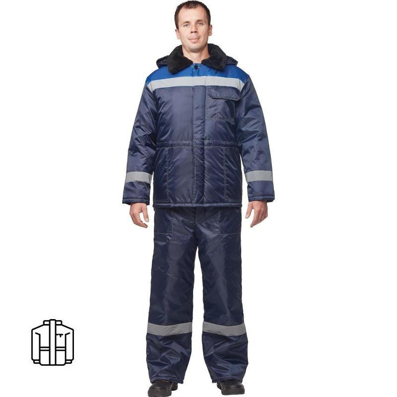 Спецодежда зимняя куртка мужская з32-КУ (размер 68-70, рост 182-188) темно-синего цвета с васильковой вставкой. Изготовлена из материала ?Оксфорд? (100% полиэстер) плотностью 100 г/кв.м. Утеплитель - синтепон, плотность утеплителя - 200 г/кв.м (2 слоя). Материал подкладки - 100% полиэстер. Светоотражающая полоса шириной 5 см размещена спереди и сзади между кокеткой и нижней частью куртки. Куртка прямого силуэта, удлиненная, с центральной бортовой супатной застежкой на 5 петель-пуговиц. Полочка отрезная по линии кокетки. Наличие двух нижних накладных карманов с косым срезом и наличие одного накладного нагрудного кармана с клапаном с двойной контрастной отстрочкой. Низ куртки обработан швом в подгибку с закрытым срезом. По линии талии настрочена кулиса со сквозным выходом наизнанку, регулируется шаровым фиксатором и шнуром. Спинка прямая, отрезная по линии кокетки. Рукав прямой, втачной, одношовный. Внутри рукава по нижней части на подкладку притачан трикотажный манжет. Воротник меховой, спереди застегивающийся на пуговицу. Куртка предназначена для защиты работающих от пониженных температур в различных отраслях промышленности, а также производственных загрязнений. Рекомендована для использования в сельском хозяйстве, логистике, легкой промышленности, строительстве. Изготавливается в соответствии с ГОСТ 12. 4. 303-2016.Коллекция зимней спецодежды з32 представлена в двух видах ткани - смесовая с влагоотталкивающей пропиткой и Оксфорд. Куртки из коллекции предлагаются в двух цветовых решениях: синий с отделкой василькового цвета и синий с отделкой яркого оранжевого цвета. К куртке з32-КУ из ткани Оксфорд подходят брюки з32-БР синего цвета из аналогичной ткани.