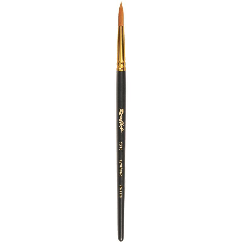 Кисть круглая синтетика Roubloff №6. Кисть круглая с укороченной вставкой из волоса рыжей жесткой синтетики на короткой матовой черной ручке с алюминиевой обоймой золотого цвета. Техника рисования: Акварель, Акрил, Гуашь, Масло, Темпера