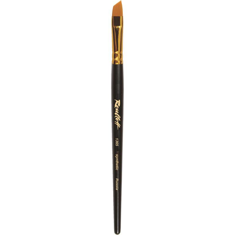Кисть с наклоном синтетика Roubloff №8. Кисть наклонная с уороченной вставкой из волоса рыжей жесткой синтетики на короткой черной матовой ручке с алюминиевой обоймой золотого цвета. Используется для прорисовки мелких фигур и краеугольных форм. Техника рисования: Акварель, Акрил, Гуашь, Масло, Темпера