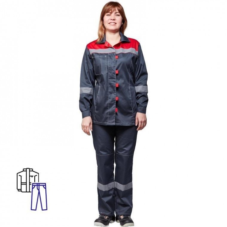 Спецодежда летняя костюм женский л20-КБР состоит из куртки и брюк (размер 56-58, рост 158-164) серого цвета с красными вставками на куртке. Изготовлен из смесовой ткани (68% полиэстер, 32% хлопок), плотностью 210 г/кв.м. Куртка прямого силуэта с притачным поясом и боковыми вставками с эластичной лентой, для лучшего прилегания. Для защиты от истирания локтевая и коленная части костюма усилены. Все элементы костюма выделены контрастной отстрочкой. На кокетке, рукавах, и брючинах светоотражающая полоса — 5 см. Костюм обеспечивает защиту от производственных загрязнений. ГОСТ 27574-87.