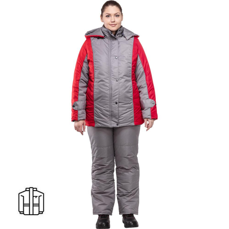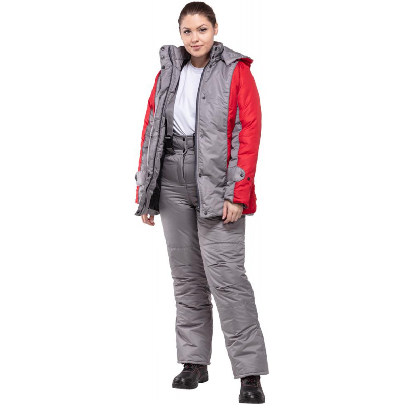 Спецодежда зимняя куртка женская з10-КУ (размер 40-42, рост 170-176) серого цвета с красными вставками. Изготовлена из ткани Hi-Tech membrane (100% полиэстер) плотностью 95 г/кв.м. Утеплитель из синтепона плотностью 200 г/кв.м (2 слоя). Зимняя куртка прямого кроя с центральной застежкой на молнию и кнопки, с карманами на молнии в шве рельефов, широким воротником-стойкой, съемным капюшоном и регулировкой ширины по низу рукава патой на кнопке, низ куртки регулируется кулиской. Водонепроницаемость - 5000, паропроницаемость - 5000 г/кв.м. Куртка водонепроницаема, обеспечивает защиту от пониженных температур и производственных загрязнений. Рекомендована для использования в логистике, легкой промышленности, строительстве. ГОСТ 12. 4. 303-2016.К курткам з10-КУ из коллекции зимней рабочей одежды з10 подходят полукомбинезоны з10-ПК из этого же материала. Также можно подобрать брюки з10-БР.