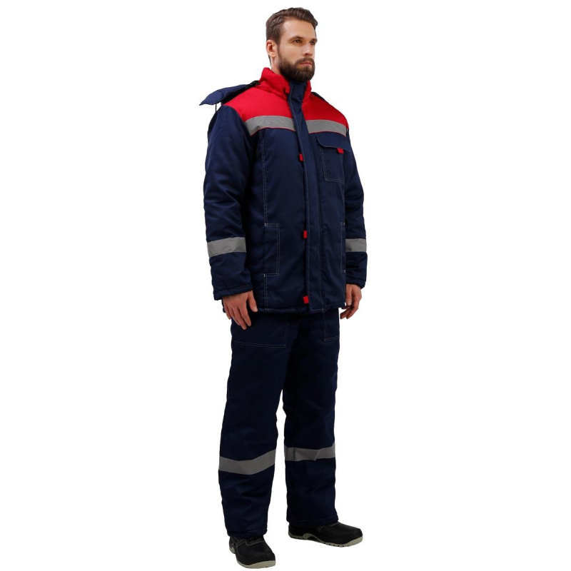 Спецодежда зимняя костюм мужской з31-КПК состоит из куртки и полукомбинезона (размер 64-66, рост 170-176) синего цвета с красными вставками и контрастной отстрочкой. Изготовлен из смесовой ткани (35% хлопок, 65% полиэстер), плотность ткани - 220 г/кв.м. Утеплитель - синтепон, плотность утеплителя куртки - 200 г/кв.м (2 слоя), полукомбинезона - 200 г/кв.м (1 слой). Материал подкладки - 100% полиэстер. Светоотражающая полоса размещена на груди, спине, рукавах, а также внизу полукомбинезона. Куртка с центральной застежкой на молнию, ветрозащитным клапаном, съемным капюшоном, имеет два нижних внутренних кармана и один верхний накладной, трикотажные напульсники. Полукомбинезон классического покроя с центральной молнией, с двумя нижними накладными карманами. Костюм обеспечивает защиту от пониженных температур и производственных загрязнений. ГОСТ 12. 4. 303-2016. Имеется заключение Минпромторга, с которым можно вернуть до 20% компенсации от расходов на обязательное социальное страхование от несчастных случаев на производстве и профессиональных заболеваний.Костюмы, состоящие из куртки и полукомбинезона, из коллекции зимней спецодежды з31 представлены в нескольких цветовых сочетаниях: серый с контрастной отделкой красного цвета и синий, с аналогичной красной отделкой.