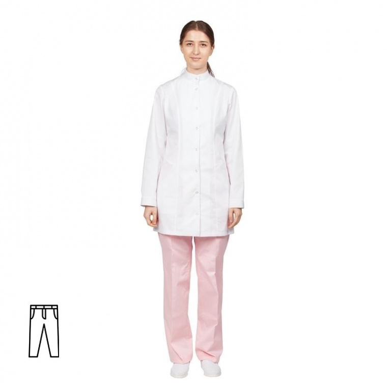 Брюки женские М-14-БР прямые изготовлены из ткани Санторини ( 55% хлопок 45% полиэстер) плотностью 150 г/кв. м с водоотталкивающей пропиткой. Цвет розовый, размер 48-50, рассчитаны на рост 170-176. Пояс притачной на резинке. Брюки с застроченными стрелками на передних половинках. На правой передней половинке брюк расположен накладной карман, который одной стороной входит в боковой шов. Стирку брюк необходимо производить в обычном режиме, не превышая температуру 40 градусов Цельсия. Запрещено отбеливать, разрешена химчистка в обычном режиме. Сушить в подвешенном состоянии не отжимая, утюжить при температуре не выше 150 градусов. Брюки относятся к спецодежде для защиты от общих производственных загрязнений.