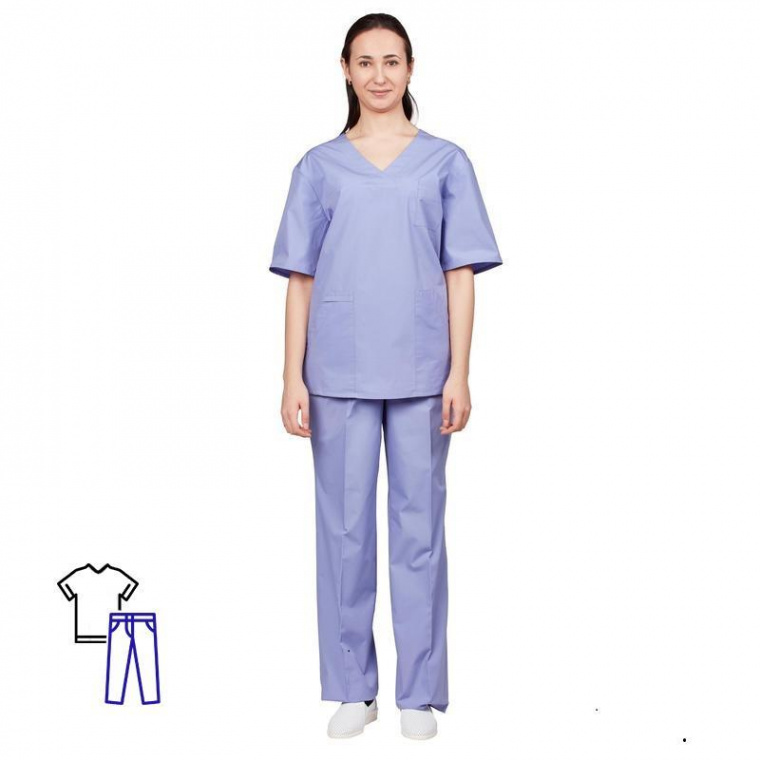 Костюм женский м15-КБР лавандового цвета состоит из туники и брюк. Размер 56-58, рассчитан на рост 158-164. Изготовлен из ткани Toray (65% полиэстер, 35% хлопок), плотностью 122+/-5 г/кв.м. Туника прямого силуэта с короткими рукавами. Полочка с притачной кокеткой, нижняя часть полочки состоит из центральной и двух боковых. На полочке нагрудный накладной карман и два нижних накладных кармана. Горловина полочки и спинки обрабатывается обтачкой. Спинка с притачной кокеткой, нижняя часть спинки цельнокроеная. Низ рукава обработан в подгибку с закрытым срезом. Низ изделия прямой. Брюки прямые. Пояс притачной на резинке. Брюки с застроченными стрелками на передних половинках брюк, на правой передней половинке брюк расположен накладной карман, который одной стороной входит в боковой шов. Стирку костюма необходимо производить в обычном режиме, не превышая температуру 40 градусов Цельсия. Разрешена химчистка в обычном режиме. Брюки запрещено отбеливать. Сушить в подвешенном состоянии не отжимая, утюжить при температуре не выше 150 градусов. Костюм относится к спецодежде для защиты от общих производственных загрязнений.