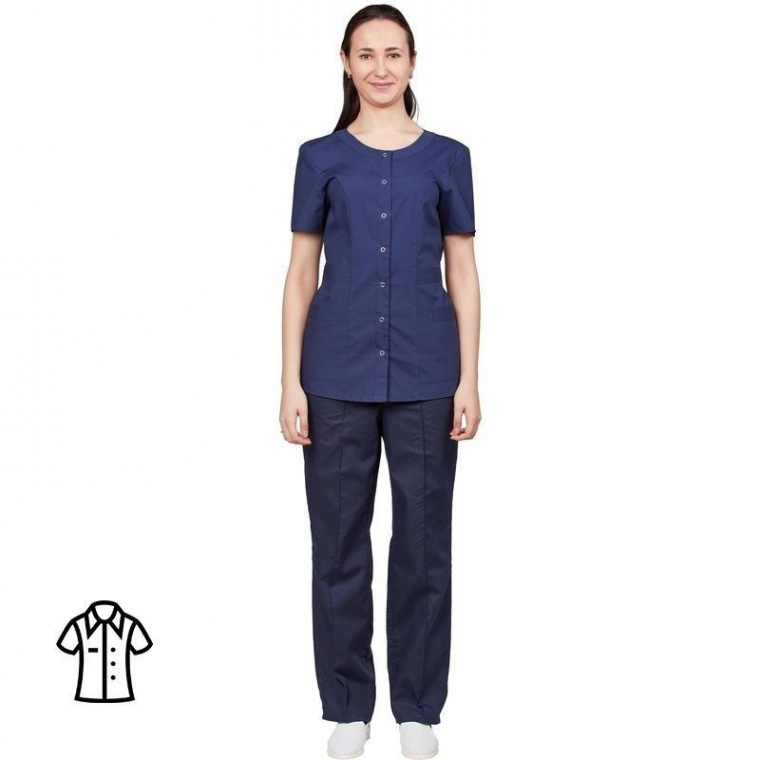 Медицинская блуза женская м16-БЛ полуприлегающего силуэта изготовлена из смесовой ткани Ти-Си (35% хлопок, 65% полиэстер) плотностью 120 г/кв. м с водоотталкивающей пропиткой. Цвет синий. Блуза с центральной застежкой на семь рубашечных металлических кнопок, с притачными планками по краю борта. На полочке вертикальные рельефы, выходящие из проймы. Полочки с двумя накладными карманами, входящими в рельефы и боковые швы. Верхний срез кармана обработан обтачкой. На боковых частях полочек на уровне линии талии настрочены планки, входящие в рельефы и боковые швы. Вырез горловины круглый, обработан обтачкой на лицо. Спинка цельнокроеная. На спинке на уровне линии талии два полупояса, выходящие из боковых швов. Рукава одношовные, короткие. Низ рукава обработан вподгибку с открытым срезом. Вместе с брюками составит медицинский костюм. Медицинская одежда стирается в обычном режиме, не превышая температуру 40 градусов Цельсия. Запрещено отбеливать, разрешена химчистка в обычном режиме. Сушить в подвешенном состоянии не отжимая, утюжить при температуре не выше 150 градусов. Блуза относится к спецодежде для защиты от общих производственных загрязнений. Рекомендована для использования в сфере красоты и здоровья: медицинские центры, салоны красоты. Размер 48-50, рассчитана на рост 158-164. Длина по спинке (измеряется от шва втачивания воротника до низа) 64,5 +/- 1 см; Длина по полочке (измеряется от высшей точки горловины до низа) 67,6 +/- 1 см; Ширина по груди (измеряется в застегнутом виде на уровне проймы) 54,2 +/- 1 см; Ширина по талии (измеряется в застегнутом виде на уровне пояса) 52,1 +/- 1 см; Ширина спинки (измеряется в самом узком месте) 44,7 +/- 1 см; Ширина по низу (измеряется в застегнутом виде) 58,5 +/- 1см; Длина рукава (измеряется от плеча до манжеты) 21 +/- 1 см; Ширина рукава (измеряется под проймой в двое сложенном виде) 21,8 +/- 0,5 см; Ширина рукава по низу (измеряется по манжете, в двое сложенном виде) 19,8 +/- 0,5 см; Ширина плеча 13,2 +/- 0,5 см.