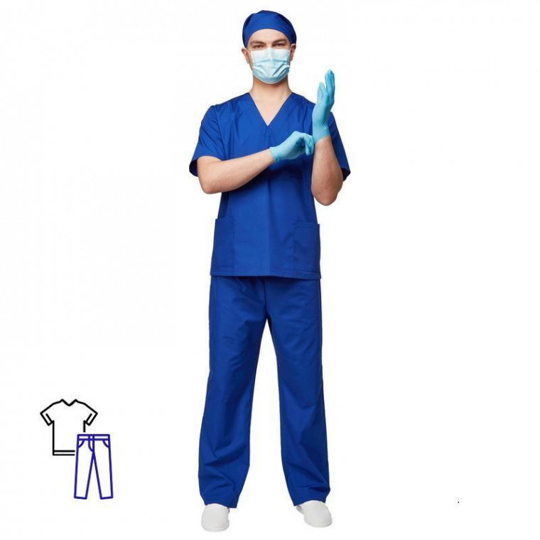 Костюм хирурга универсальный м05-КБР васильковый (размер 44-46, рост 158-164) изготовлен из ткани василькового цвета, состав — 65% полиэфира и 35% хлопка. Плотность материала составляет 120 г/кв. м, благодаря чему обеспечивается легкость изделия. Ти-Си — материал, приятный на ощупь, гигиеничен и долговечен. Не мнется, легко и быстро стирается, быстро сохнет. Долго сохраняет свой первоначальный яркий цвет. Ткань «дышит», благодаря входящему в состав хлопку, имеет повышенный срок службы и проста в уходе, благодаря полиэфиру. Медицинский костюм состоит из куртки и брюк, подходит и для женщин, и для мужчин. Куртка с коротким рукавом и нагрудным карманом, свободный покрой обеспечивает удобство в работе. Брюки прямые на резинке. Униформа рекомендована для сферы красоты и здоровья: медицинские учреждения, центры. Соответствует ГОСТ 9897-88