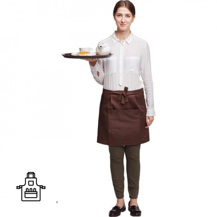 Фартук официанта универсальный короткий коричневого цвета, завязывающийся по талии поясом, с одним накладным карманом спереди. Изготовлен из смесовой ткани с водоотталкивающей пропиткой (65% полиэстер, 35% хлопок), плотностью 210 г/кв.м. Фартук из качественной и износостойкой ткани, подходит для работы в кафе, ресторанах, различных заведениях общепита. Отлично смотрится и хорошо защищает одежду вашего персонала.