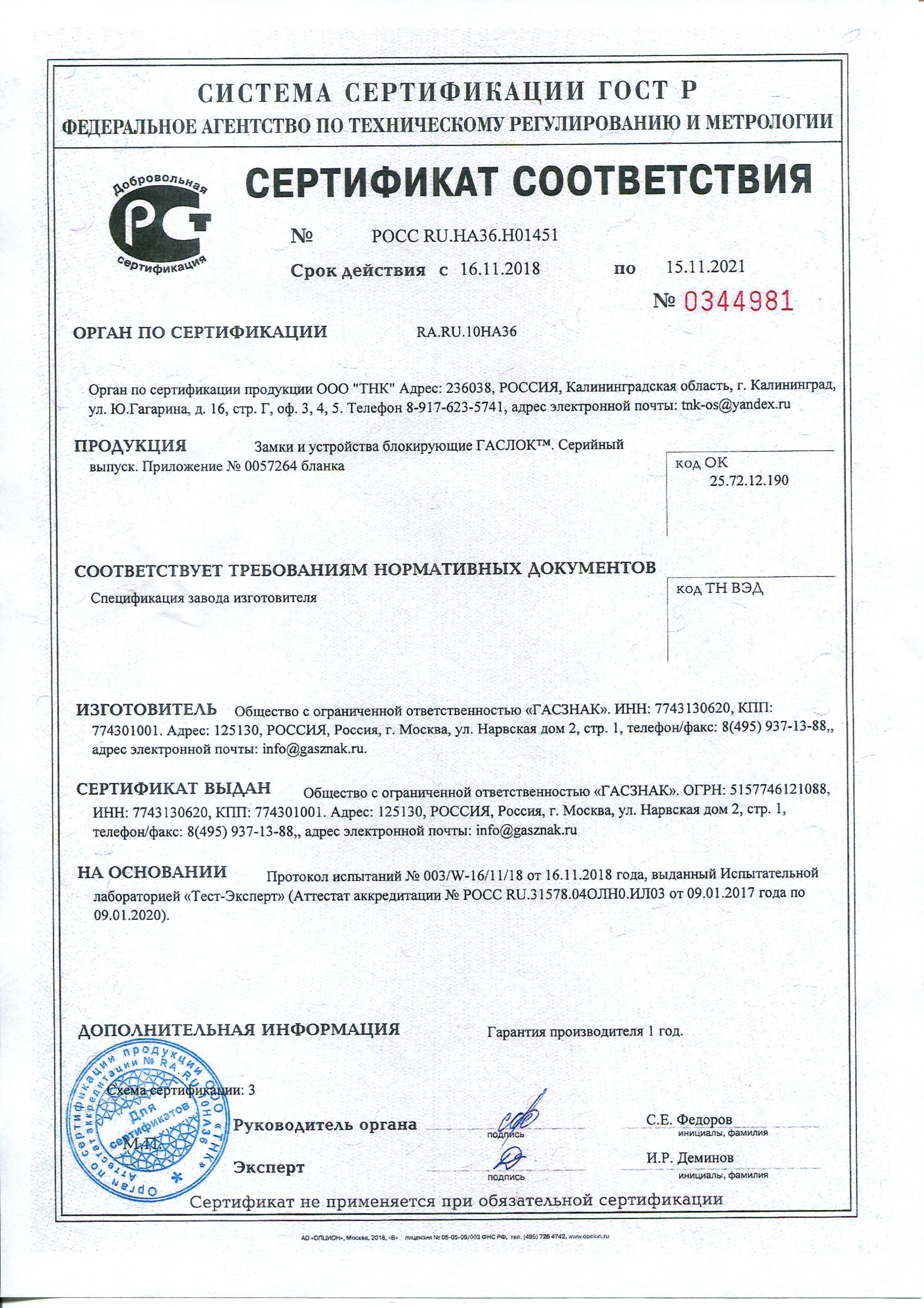 Сертификат на товар - Замок навесной Гаслок с металлической дужкой 4.76 мм красный (артикул производителя GL-8521N-KD-RED)