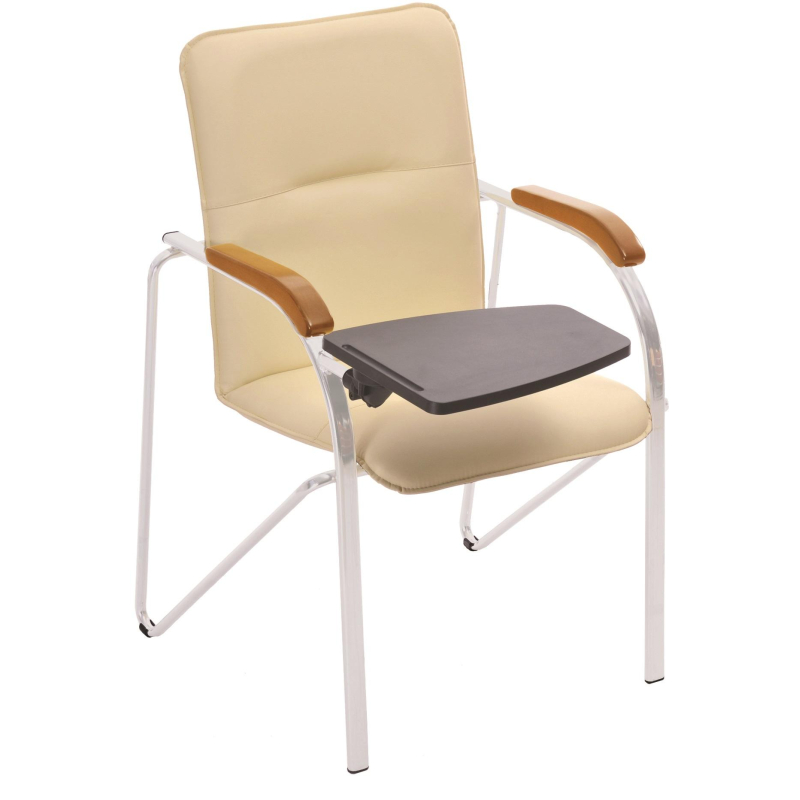 Конференц-кресло Samba ST (со столиком) подходит для конференц-залов, для приема посетителей в офисе, для дома. Обито кожзаменителем светло-бежевого цвета. Каркас выполнен из серебристого металла.На подлокотниках - деревянные вставки цвета бук. Максимальная статическая нагрузка - 100 кг.Изображения товаров на сайте не могут гарантировать точную цветопередачу.