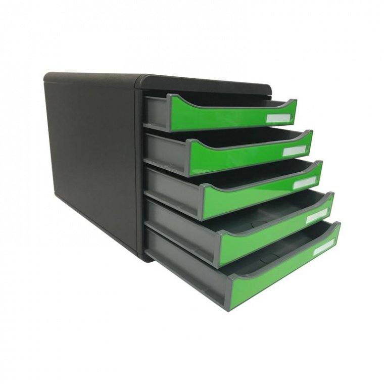Бокс Exacompta Big Box Plus с пятью закрытыми выдвижными лотками для хранения и сортировки документов и печатной продукции формата А4+. Прочный монолитный корпус обеспечивает большую загрузку лотков и возможность поставить боксы друг на друга (штабелировать). Закрытые лотки защищают содержимое от пыли и обеспечивают конфиденциальность документов. Прорезь на фасаде позволяет их легко выдвигать или положить документ не выдвигая лотка, ограничитель хода для безопасного открывания. Удобные пропорции для письменного стола. Держатель этикетки, включая набор понедельник — воскресенье, в комплекте. Цвет: черный/зеленый. Размеры (ДxШxВ) : 347×278×271 мм. 25 лет гарантии.