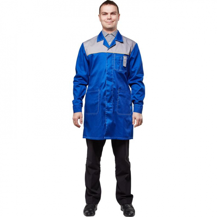 Халат рабочий мужской у19-ХЛ (размер 56-58, рост 170-176) василькового цвета с серыми вставками. Изготовлен из смесовой ткани (80% полиэстер, 20% хлопок), плотностью 210 г/кв.м. Халат с нагрудным и двумя нижними накладными карманами, застегивается на пуговицы, имеет длинные рукава с манжетами на пуговицах. Халат обеспечивает защиту от производственных загрязнений. ГОСТ 12.4.280-2014