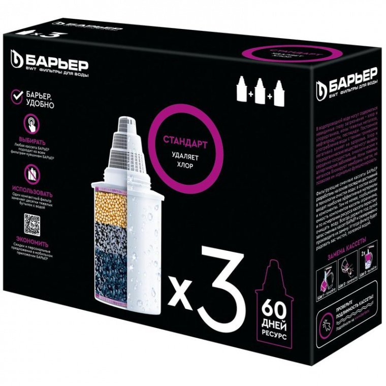 Базовая очистка водопроводной воды от хлора и других вредных примесей. Удаляет посторонние привкусы и запахи. Комплект включает 3 кассеты с ресурсом 350 л.