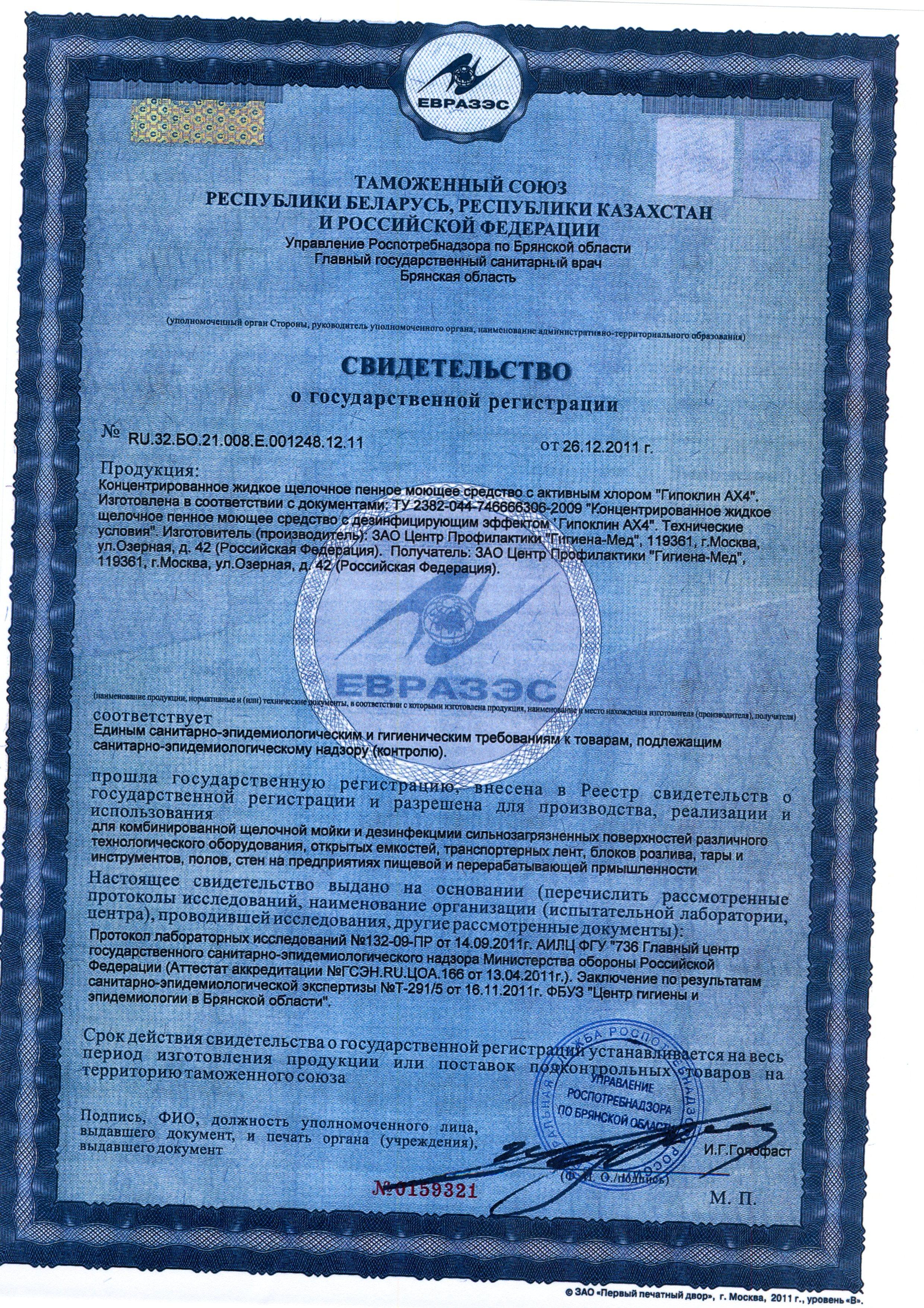 Сертификат на товар - Универсальное моющее средство Гипоклин АХ4 5 л (концентрат)