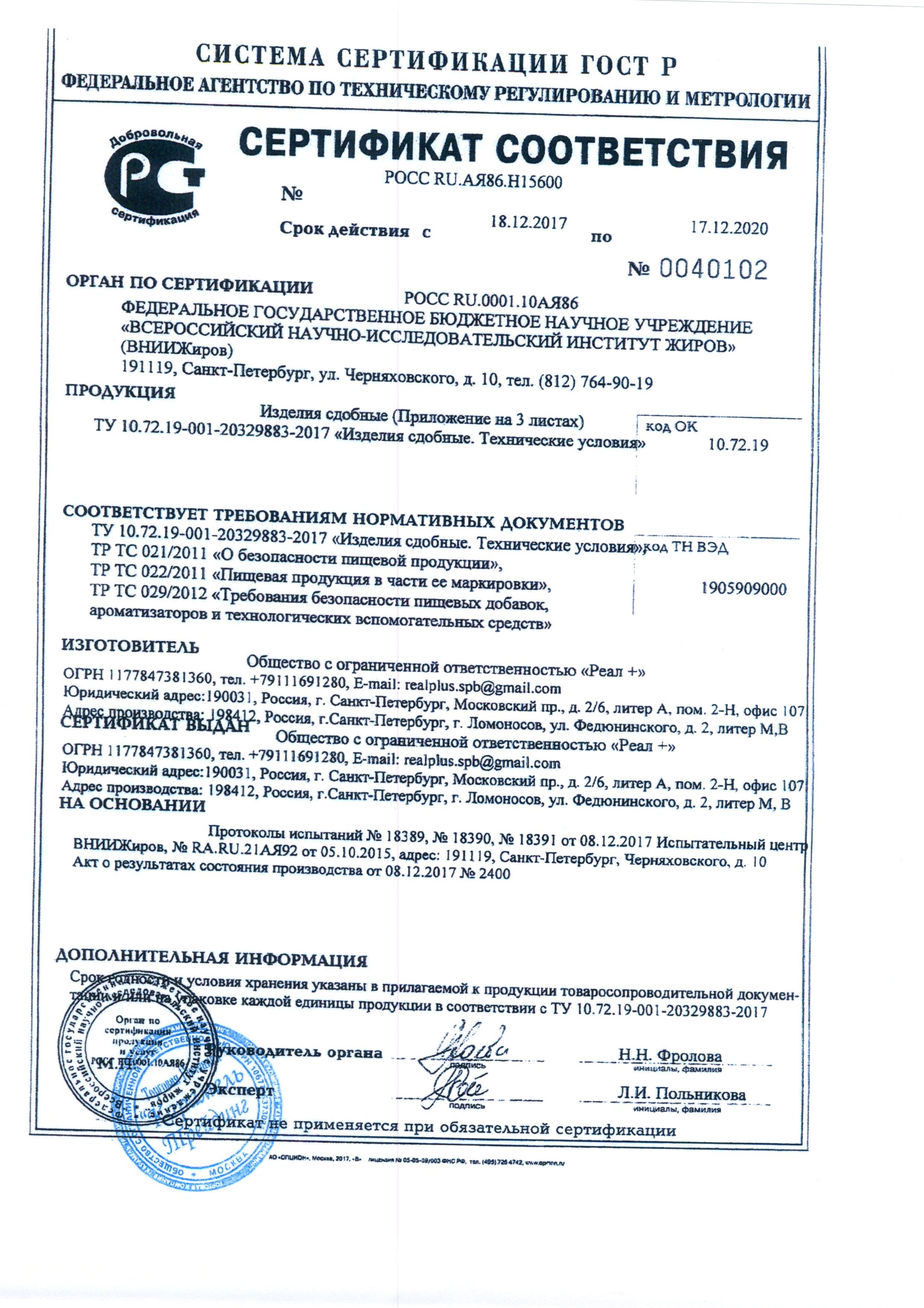Пищевая ценность на 100 г продукта (не менее): белки — 10,0 г, жиры — 26,0 г, углеводы — 48,0 г.