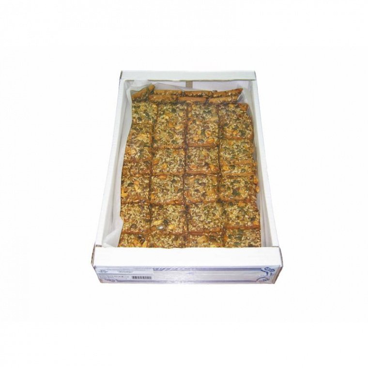 Состав: мука пшеничная в/c, маргарин для выпечки (рафинированные дезодорированные масла (пальмовое, модифицированное пальмовое, подсолнечное), вода, эмульгаторы (моно- и диглицериды пищевых жирных кислот, полиэксиэтилен, соевый лецитин), соль, консерванты (сорбиновая кислота, бензоат натрия), регулятор кислотности лимонная кислота), сахар-песок, ядро подсолнечника, патока карамельная, арахис очищенный, семечки тыквенные, меланж жидкий, семена льна, семена кунжута, вода питьевая, разрыхлитель бикарбонат натрия, усилитель запаха ванилин.