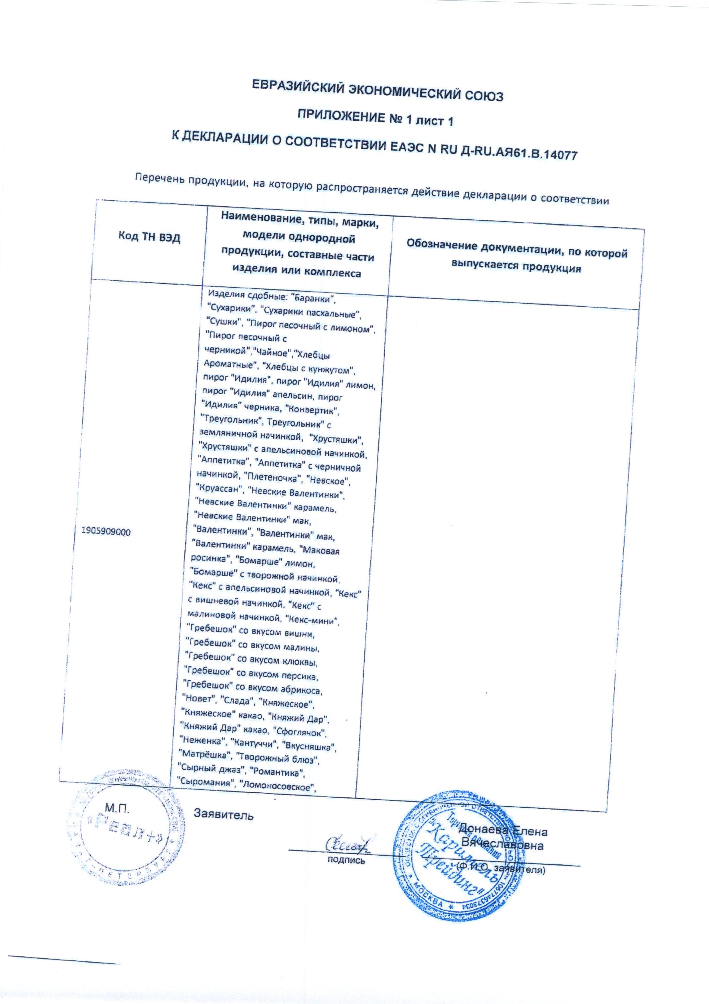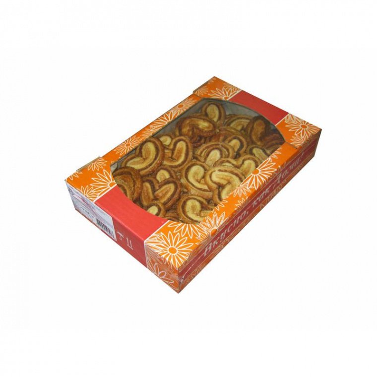Состав: мука пшеничная хлебопекарная в/с, сахар-песок, маргарин для слоеного теста (рафинированные дезодорированные растительные масла: пальмовое, пальмовое модифицированное, модифицированное подсолнечное, подсолнечное), вода, эмульгаторы (моно- и диглицериды жирных кислот, полиглицирина и жирных кислот эфиры, соевый лецитин), соль, консерванты (сорбиновая кислота, бензоат натрия), краситель (каротины), ароматизатор масла, регулятор кислотности лимонная кислота), маргарин молочный (рафинированные дезодорированные растительные масла, вода, соль поваренная пищевая, эмульгаторы (моноглицериды жирных кислот, эфир полиглицерина), ароматизатор «Сливки», регулятор кислотности — лимонная кислота, природный краситель куркумин), соль поваренная пищевая, какао-порошок, регулятор кислотности лимонная кислота, ароматизатор «Карамель».
