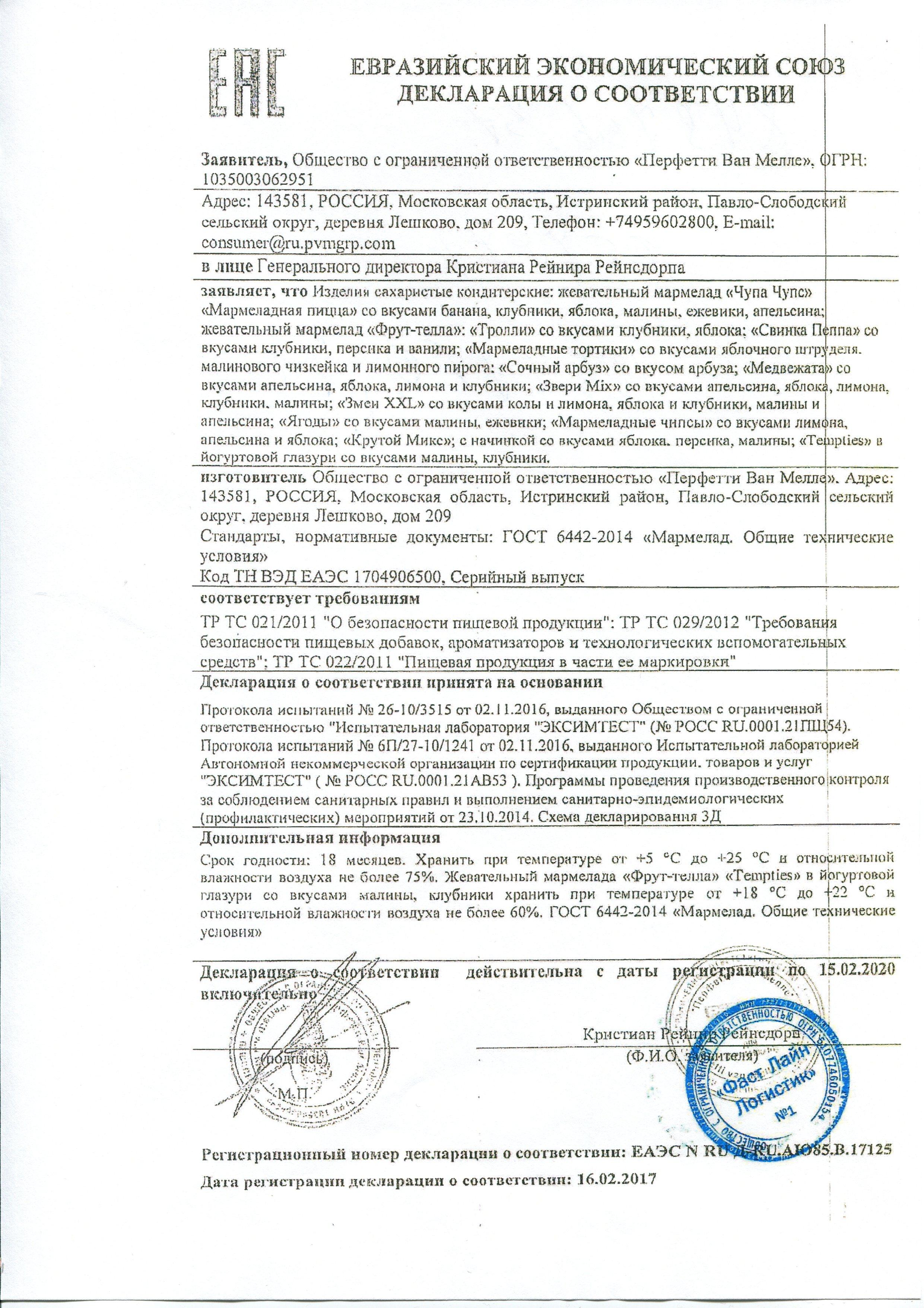 Сертификат на товар - Мармелад Fruittella Cool Mix 150 г