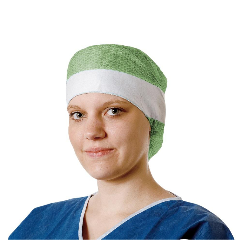 Шапочка операционная Foliodrape зеленая (60 штук в упаковке). Шапочка со специально разработанной эластичной шейной частью, подходит для длинных волос; с повязкой для пота вокруг головы.