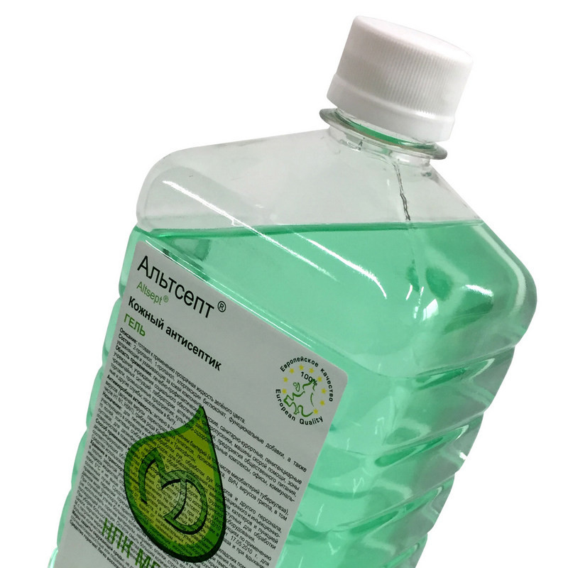 Антисептик кожный гель 'Альтсепт' спиртовой 1 л. Химический состав средства: гуанидин, спирты, вспомогательные компоненты. Действующие вещества: N-пропанол (пропанол-1) 20 %, изопропиловый спирт (пропанол-2) 50 %, компоненты, улучающие состояние кожи, хлоргексидина биглюконат 0.5 %, вспомогательные компоненты. Сфера применения: ЛПУ, клинические лаборатории, станции переливания крови, бактериологические лаборатории, детские учреждения (детсады, школы и т.п.), Предприятия общественного питания, предприятия продовольственной торговли, Коммунальные объекты (бани, бассейны, гостиницы, общественные туалеты и т.п.), учреждения соцобеспечения, парикмахерские, косметические и массажные салоны, санитарный транспорт, в быту населением, аптеки, вирусологические лаборатории. Объекты обработки: гигиеническая обработка рук, обработка инъекционного поля, обработка локтевых сгибов доноров, обработка операционного поля, обработка рук операционных медицинских сестер, акушерок и других лиц, участвующих в операциях и приеме родов, обработка рук хирургов, поверхности в помещениях, поверхности приборов и аппаратов. Класс опасности: при введении в желудок - 4; при нанесении на кожу - 4; рабочего раствора - 4. Активно в отношении: бактерии (Mycobacterium tuberculosi, возбудители ВБИ, грамотрицательные бактерии, грамположительные бактерии), вирусы (грипп, парагрипп, прочие возбудители ОРВИ), патогенные грибы (дерматофитон, кандида). Срок годности: 5 лет. Страна производства: Россия.