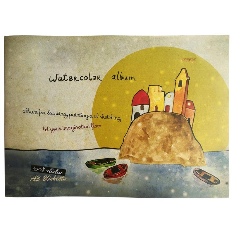 Альбом предназначен рисования акварелью и другими водорастворимыми красками, фломастерами. Формат альбома А3, размер листа 297x414 мм. Плотность обложки - 210 г/кв.м, плотность внутреннего блока - 180 г/кв.м, мелкое зерно, 100% целлюлоза. Внутренний блок - на склейке с картонной подложкой, что позволяет использовать альбом 'на весу'.
