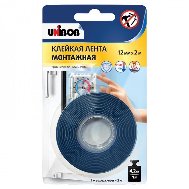 Клейкая лента двусторонняя монтажная Unibob безосновная. Применяется при монтаже светопрозрачных конструкций, витражей, мозаики, мебельного декора, установке светодиодных лент, гирлянд, именных табличек, эмблем. Идеальная замена механическому креплению, где требуется почти невидимый монтаж, например для стекла, зеркала, окна. Лента эластична, прочна, подходит к разнородным материалам, устойчива к ударным и вибрационным нагрузкам, к атмосферным факторам и химреактивам. Клеевой слой — вспененный акрил (вязкоупругая пена). Ширина — 12 мм, длина — 2 м. Толщина ленты — 1000 мкм. Цвет — кристально-прозрачный. Рабочая температура: от −40 до 120 градусов. Предел прочности при разрыве, N/см — 22.