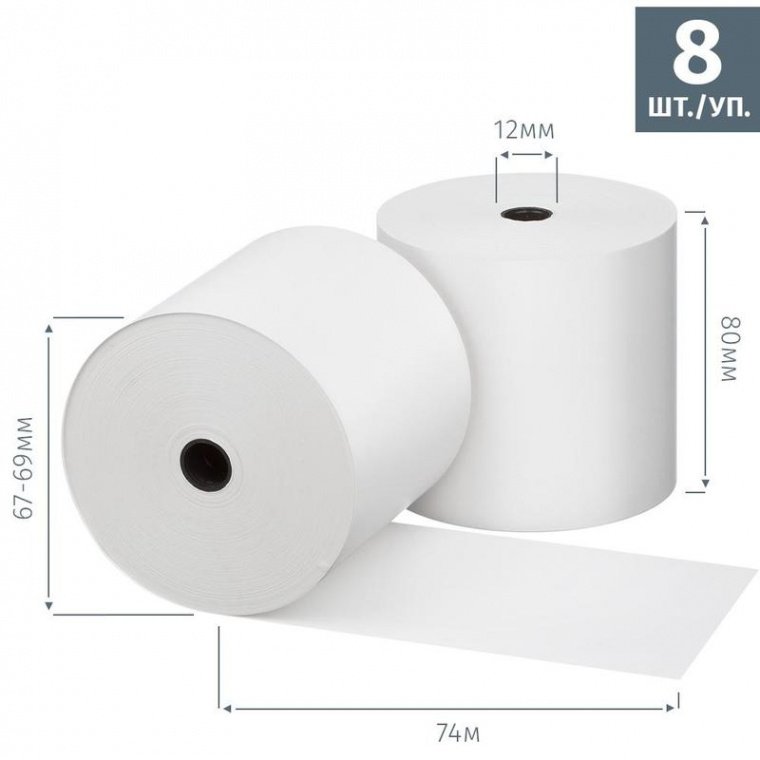 Чековая лента изготовлена из термобумаги. Бумажное полотно с наружным термослоем имеет ширину 80 мм и общую длину 74 метров. Диаметр намотки - 67-69, диаметр втулки - 12 мм. Поставляются в термоусадочной пленке и гофрокоробах. Ролики для термопечати используются в кассовых аппаратах и калькуляторах со встроенным или внешним термопринтером.
