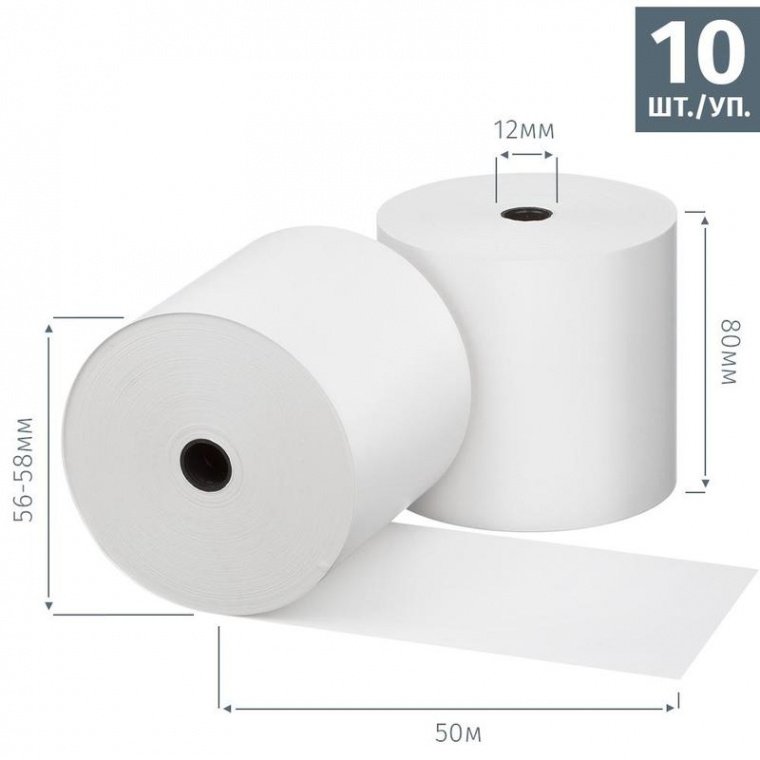 Чековая лента изготовлена из термобумаги. Бумажное полотно с наружным термослоем имеет ширину 80 мм и общую длину 50 метров. Диаметр намотки - 56-58, диаметр втулки - 12 мм. Поставляются в термоусадочной пленке и гофрокоробах. Ролики для термопечати используются в кассовых аппаратах и калькуляторах со встроенным или внешним термопринтером.