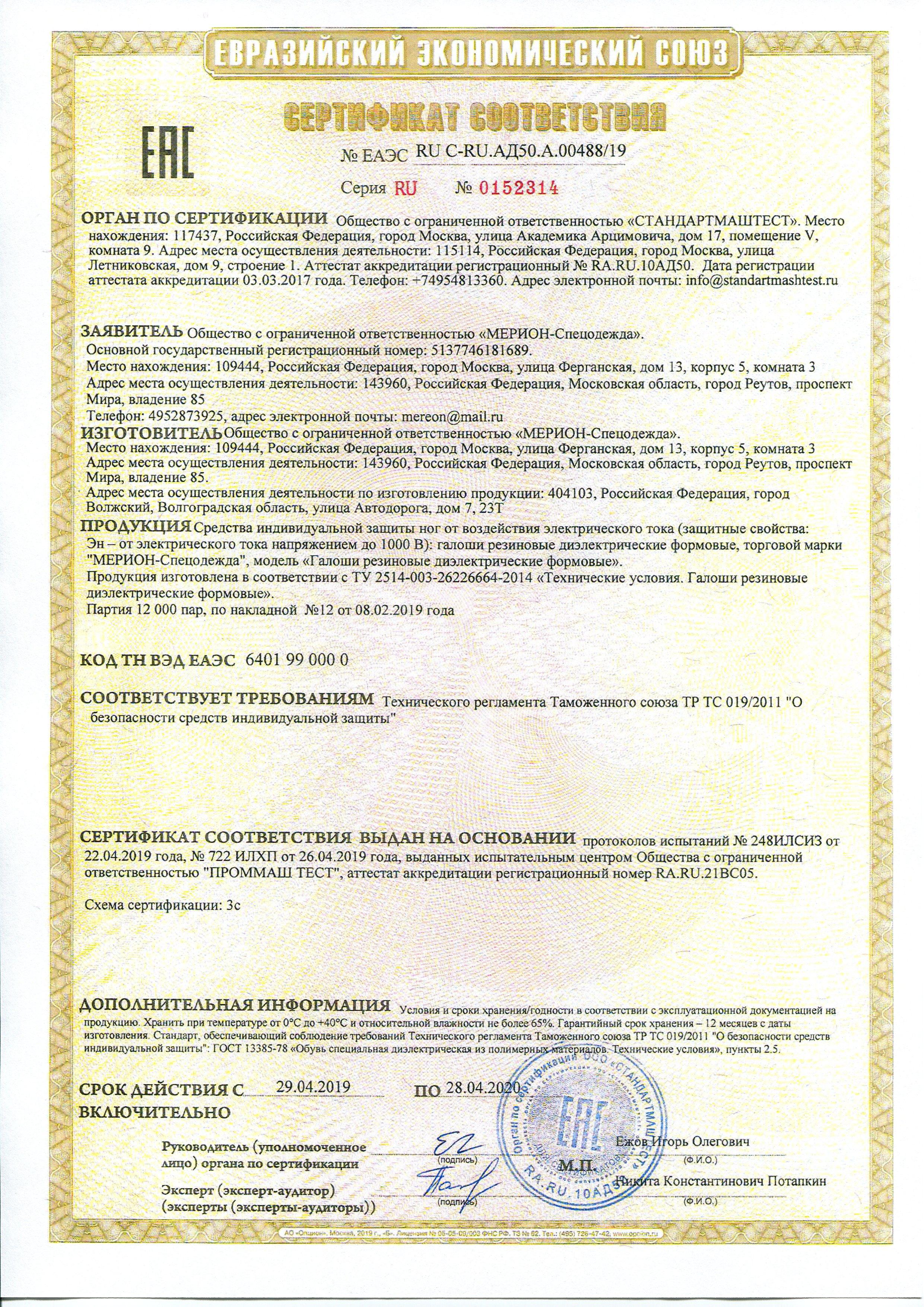 Сертификат на товар - Галоши диэлектрические резиновые размер 43 (277)