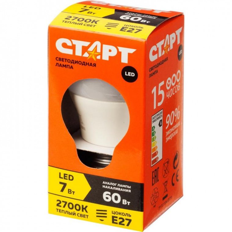 Лампа светодиодная Старт Eco 7W E27 2700k излучает теплый белый свет. Лампа шаровидной формы оснащена цоколем Е27. Нитевидный светодиод визуально напоминает традиционную нить накаливания и обеспечивает равномерное свечение с углом рассеивания света до 360 градусов и высоким уровнем цветопередачи. Лампа имеет привычный внешний вид, включается мгновенно, не содержит ртути, позволяет экономить 90% электроэнергии. Лампы такого диапазона утром способствуют мягкому пробуждению, настраивают на положительный лад и стимулируют деятельность. Также эти оттенки хороши для применения в вечернее время из-за их успокаивающего эффекта. Расслабляющий эффект пригодится в кафе, барах и ресторанах, где посетители будут чувствовать себя спокойно, или дома, для создания уютной атмосферы. Еще такие лампы часто используются в салонах мебели и освещении витрин в зимнее время. Заменяет лампу накаливания 60 Вт. Срок службы: 30000 часов.