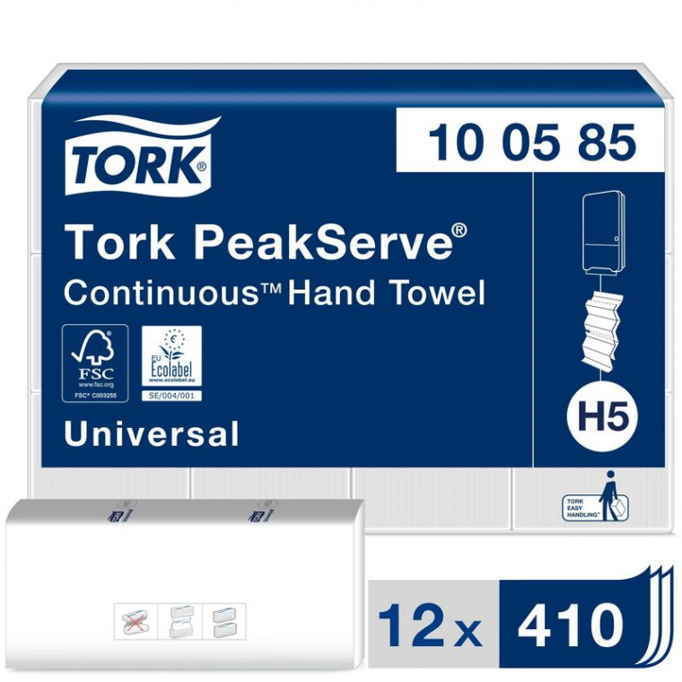 Однослойные листовые бумажные полотенца Tork PeakServe Н5 Universal Z-сложения белого цвета с тиснением. Tork PeakServe — уникальная система листовых полотенец с непрерывной подачей. Полотенца мягко подаются одно за другим, пачка за пачкой. Спрессованные пачки почти в 2 раза ниже, чем стандартные пачки листовых полотенец. Это позволяет экономить место на складе и в тележке клинера.