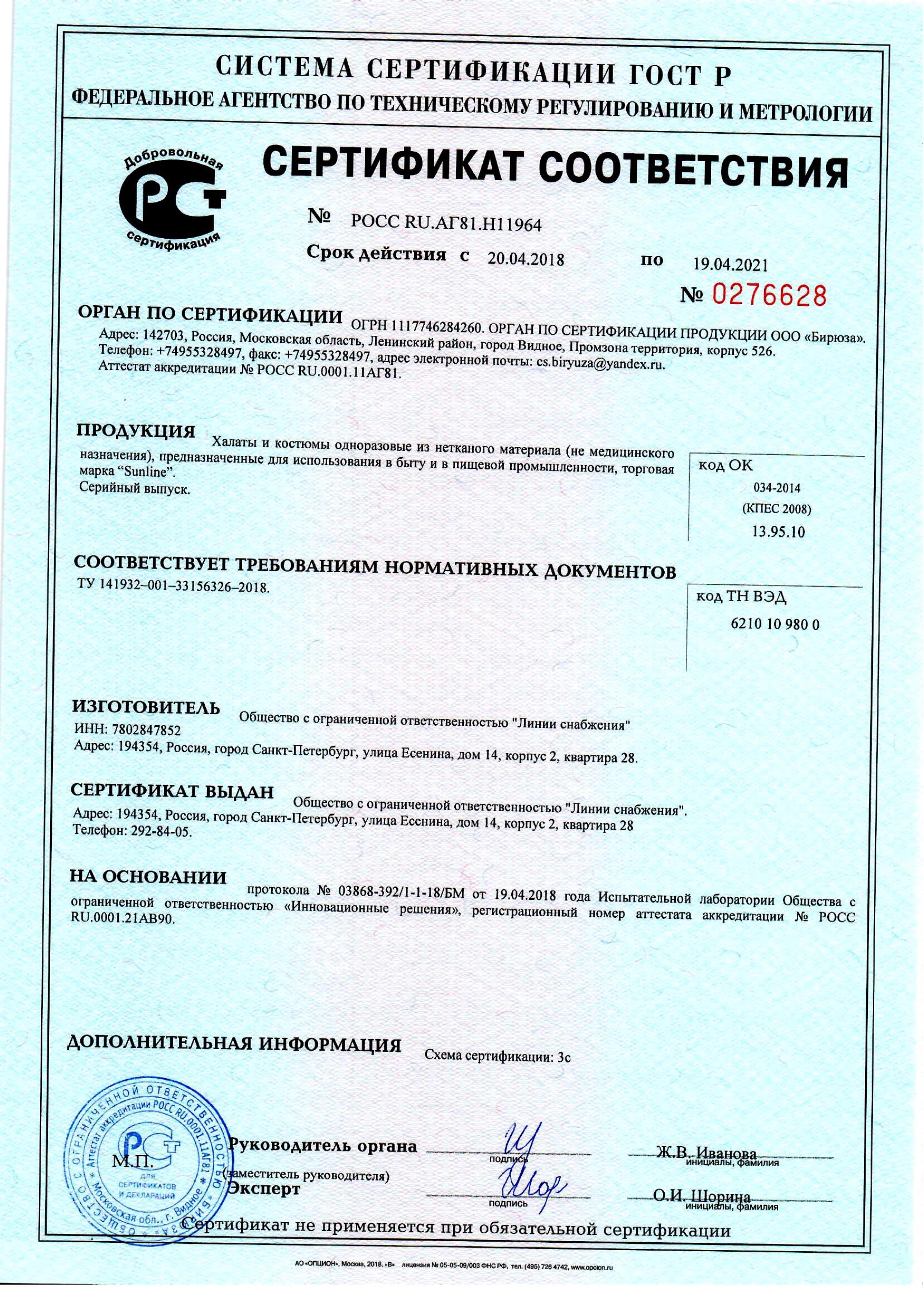 Сертификат на товар - Халат одноразовый защитный на липучке размер XL 10 штук в упаковке