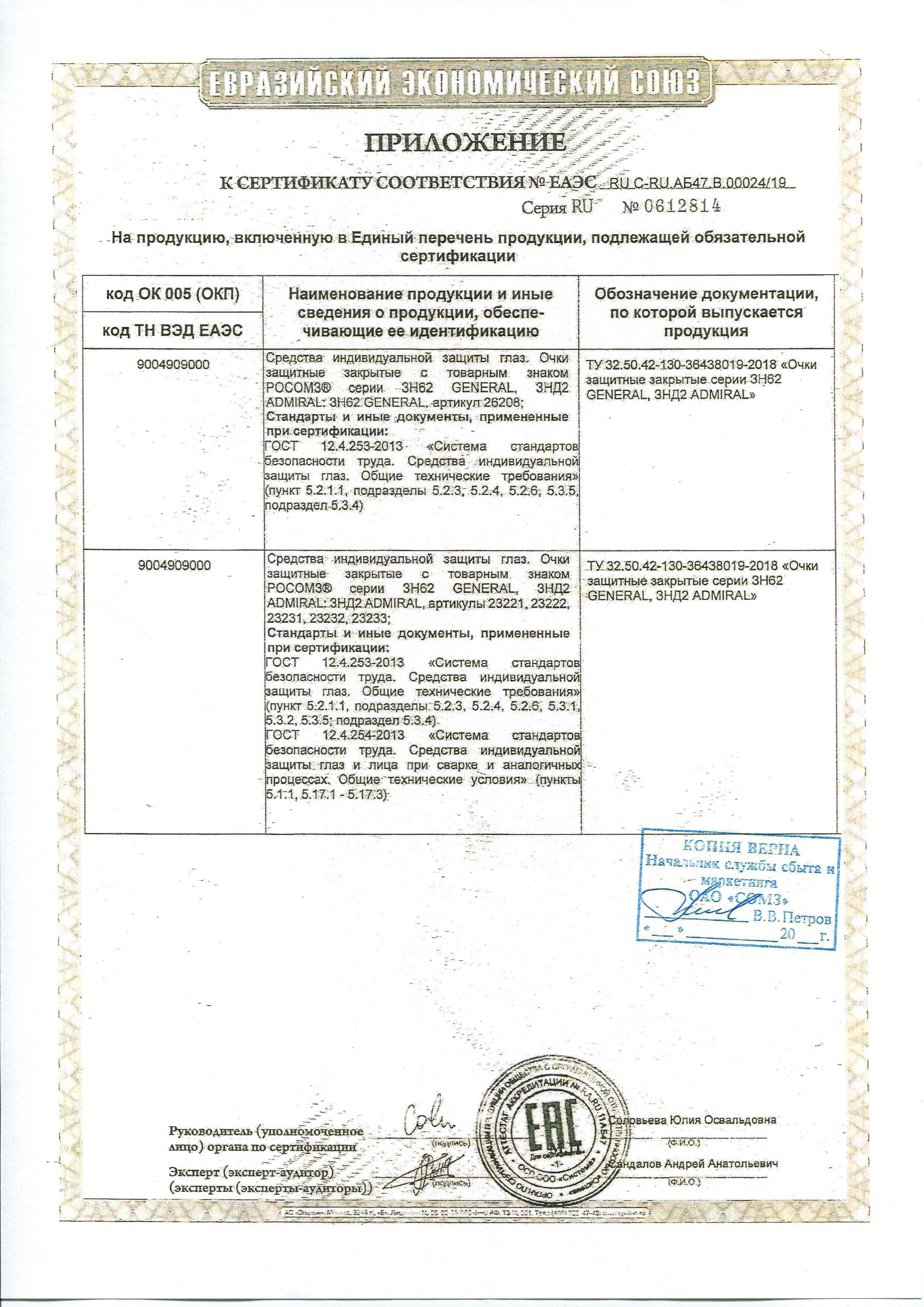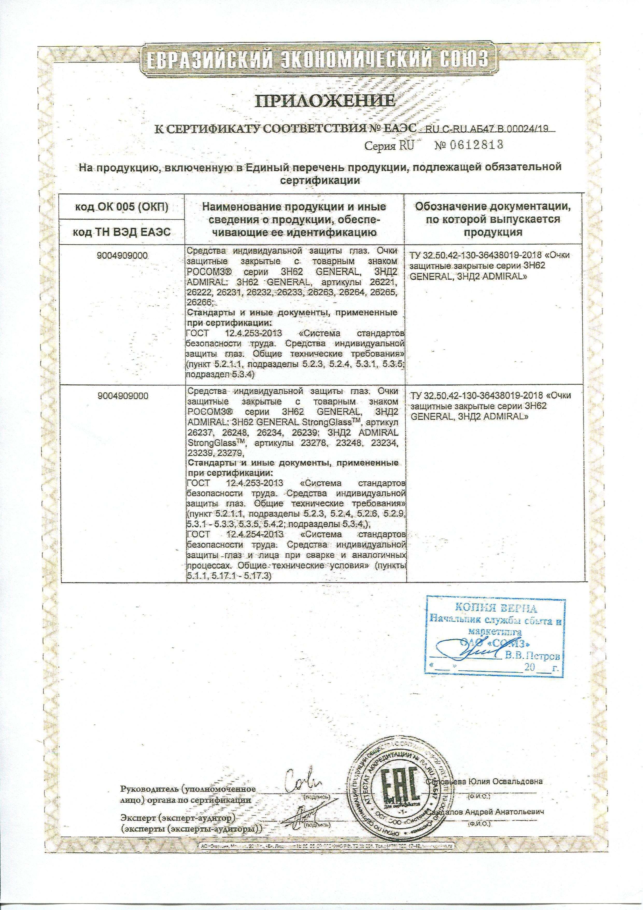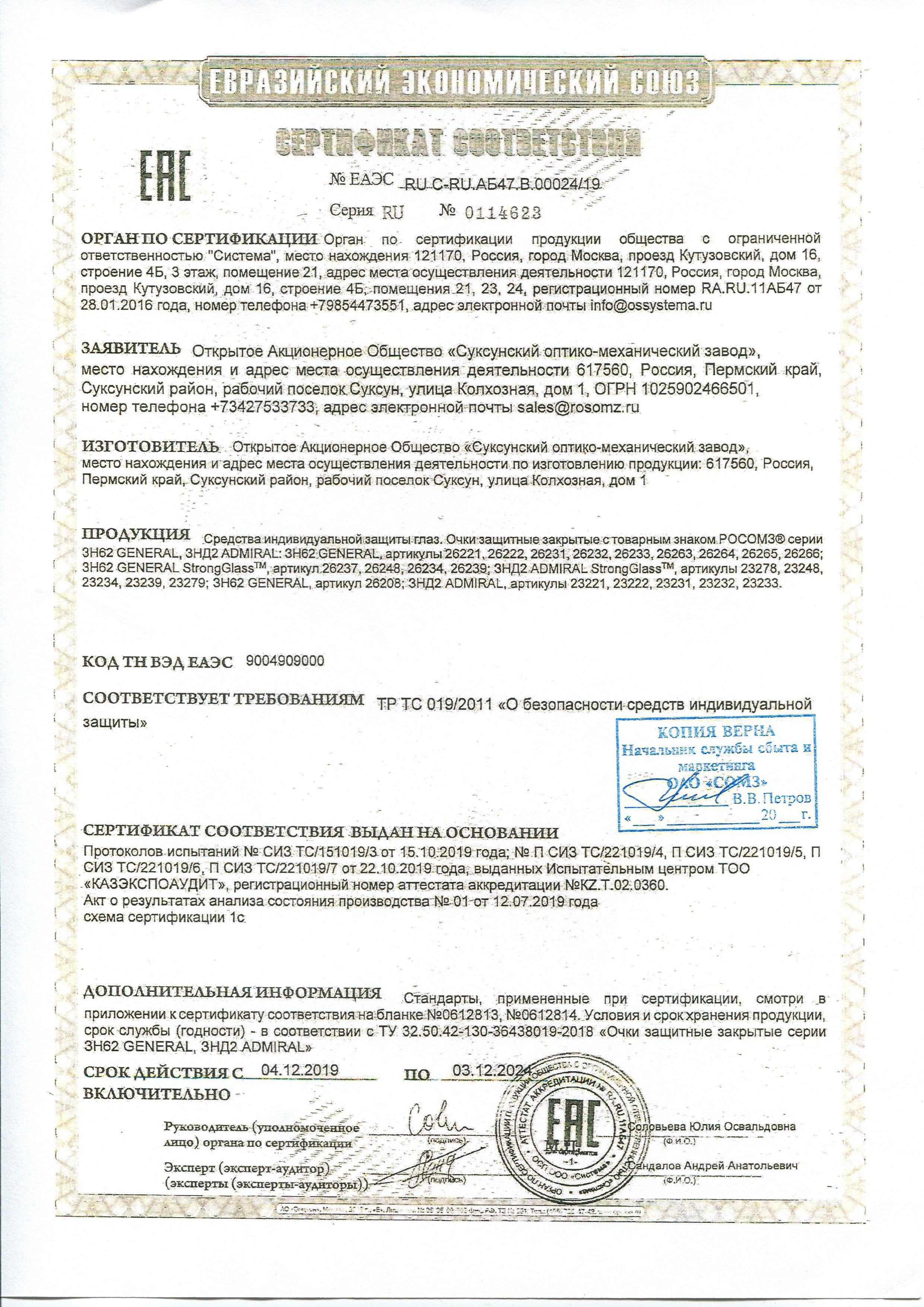 Очки защитные газосварщика РОСОМЗ с высокими эксплуатационными свойствами состоят из мягкого корпуса из ПВХ пластиката, в котором установлен жесткий стеклодержатель с прозрачными пластмассовыми защитными стеклами Plexiglas CE и откидного стеклодержателя с минеральными защитными стеклами-светофильтрами. Градационный шифр 6 (Г-2) газосварщикам при газовой сварке и резке средней мощности. Четыре вентиляционных устройства обеспечивают эффективную вентиляцию. Прозрачные защитные стекла отличаются стабильностью оптических свойств во времени, очень высокой устойчивостью к царапанию и истиранию, брызг расплавленного металла. Наголовная лента имеет регулировочные пряжки для подгонки по размеру головы пользователя. Конструкция очков '2 в 1' позволяет производить: с опущенным стеклодержателем - работы, связанные с опасным для глаз излучением; С поднятым стеклодержателем - работы, связанные с защитой глаз от воздействия твердых частиц с кинетической энергией до 3 Дж. Предназначен для защиты глаз в тяжелых условиях труда работников металлургической, машиностроительной, нефтегазодобывающей, нефтеперерабатывающей промышленности и других отраслях народно-хозяйственного комплекса России и стран СНГ.