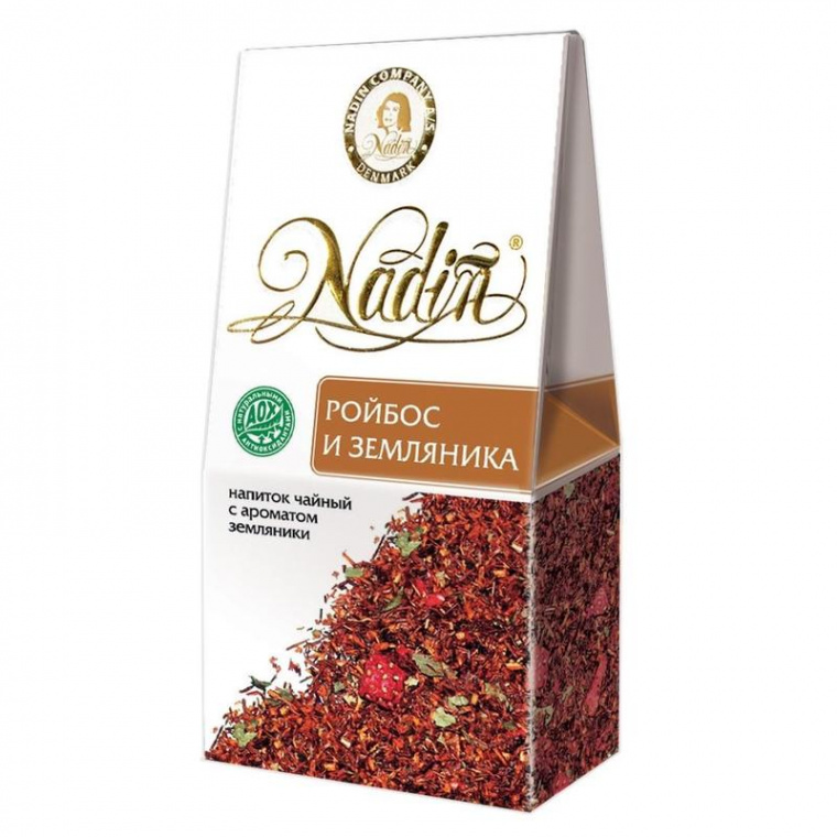Чайный напиток Nadin Ройбос и земляника травяной 50 г — чайный напиток на основе листьев южноафриканского растения ройбос с добавлением кусочков и листочков клубники, с ароматом земляники. При заваривании дает настой красного цвета со сладковатым, благодаря наличию с составе ройбоса глюкозы, вкусом и нежным ароматом земляники. Напиток прекрасно тонизирует и утоляет жажду.