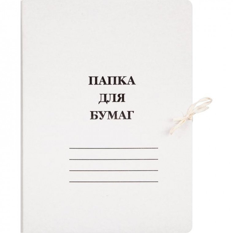Папка для бумаг формата А4 с завязками, упаковка из 10 штук. Изготовлены из мелованного картона белого цвета (плотность 440 г/кв. м), на лицевой стороне есть поля для подписывания. Вместимость — до 200 листов стандартной плотности. Папка картонная на завязках внутри оснащена тремя клапанами, благодаря которым документы не выпадают.