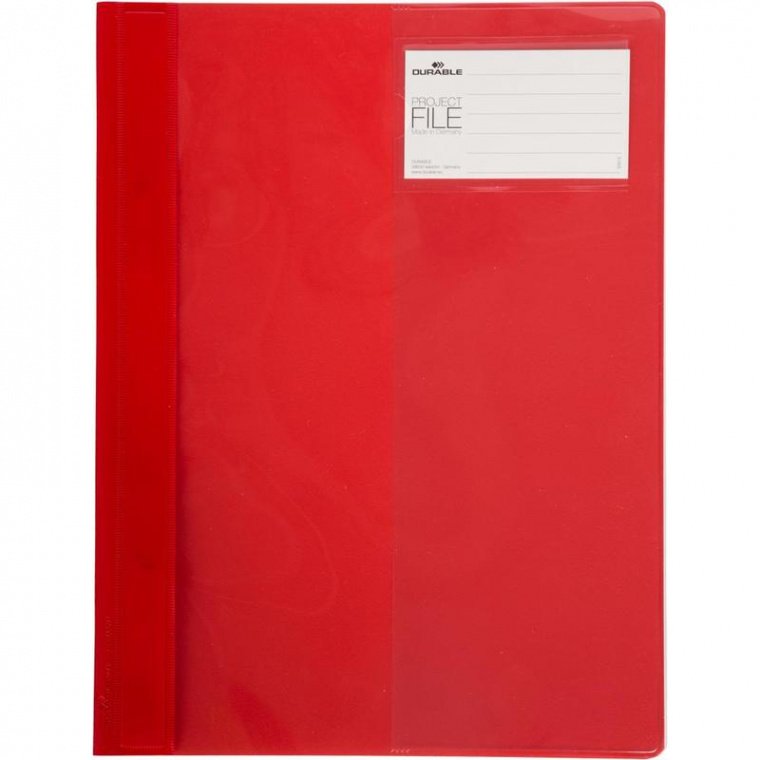 Папка-скоросшиватель Durable Project File для документов А4 с прозрачной верхней обложкой, выполнена из износостойкого пластика, имеет карман для титульного листа с внутренней стороны 110×310 мм и карман для визитной карточки и маркировки 90×54 мм на обложке. Вмещает до 100 листов. Может комбинироваться с подвесной шиной 1531 для использования в тележках для подвесных папок. Механизм сшивания документов имеет пластиковое покрытие и защитные уголки.