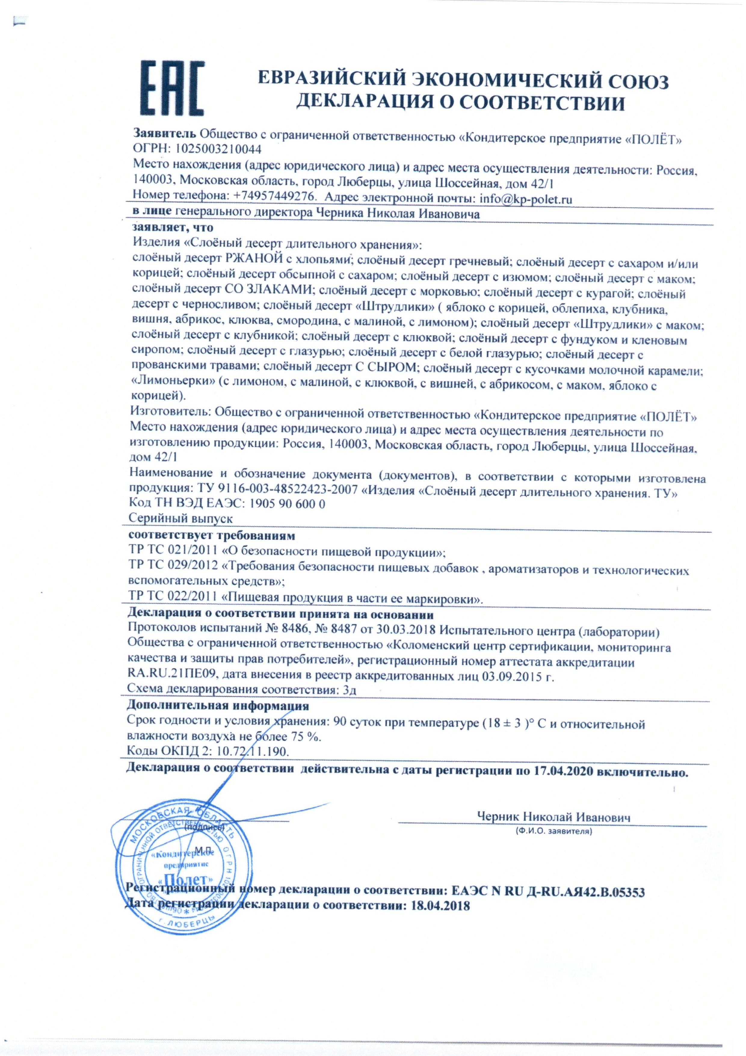 Состав: мука пшеничная хлебопекарная в/с, наполнитель (сахар, пюре яблочное, патока, лимон протертый, стабилизатор пектин, ароматизатор, регулятор кислотности — лимонная кислота, краситель-лютеин, консервант- сорбат калия), маргарин (рафинированные дезодорированные растительные масла, вода, эмульгаторы: моно- и диглицериды жирных кислот; соль поваренная пищевая, ароматизатор, краситель: каротины), вода питьевая, сахар, меланж яичный, регулятор кислотности — лимонная кислота.