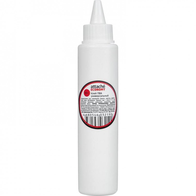 Клей ПВА Attache Economy предназначен для склеивания бумаги, картона, дерева, ткани, кожи, фотобумаги. Рекомендованно хранение при положительных температурах. При длительном хранении допустимо выделление жидкой прозрачной фазы. Допускается траспортировка клея при t ниже 0. В упаковке содержится 85 г (84.1 мл) клея ПВА. Клей морозостойкий. Выдерживает 5 циклов заморозки/разморозки при температуре до −40°С. Показатель прочности (клеящая способность): 0.36kH (1.15Мпа).