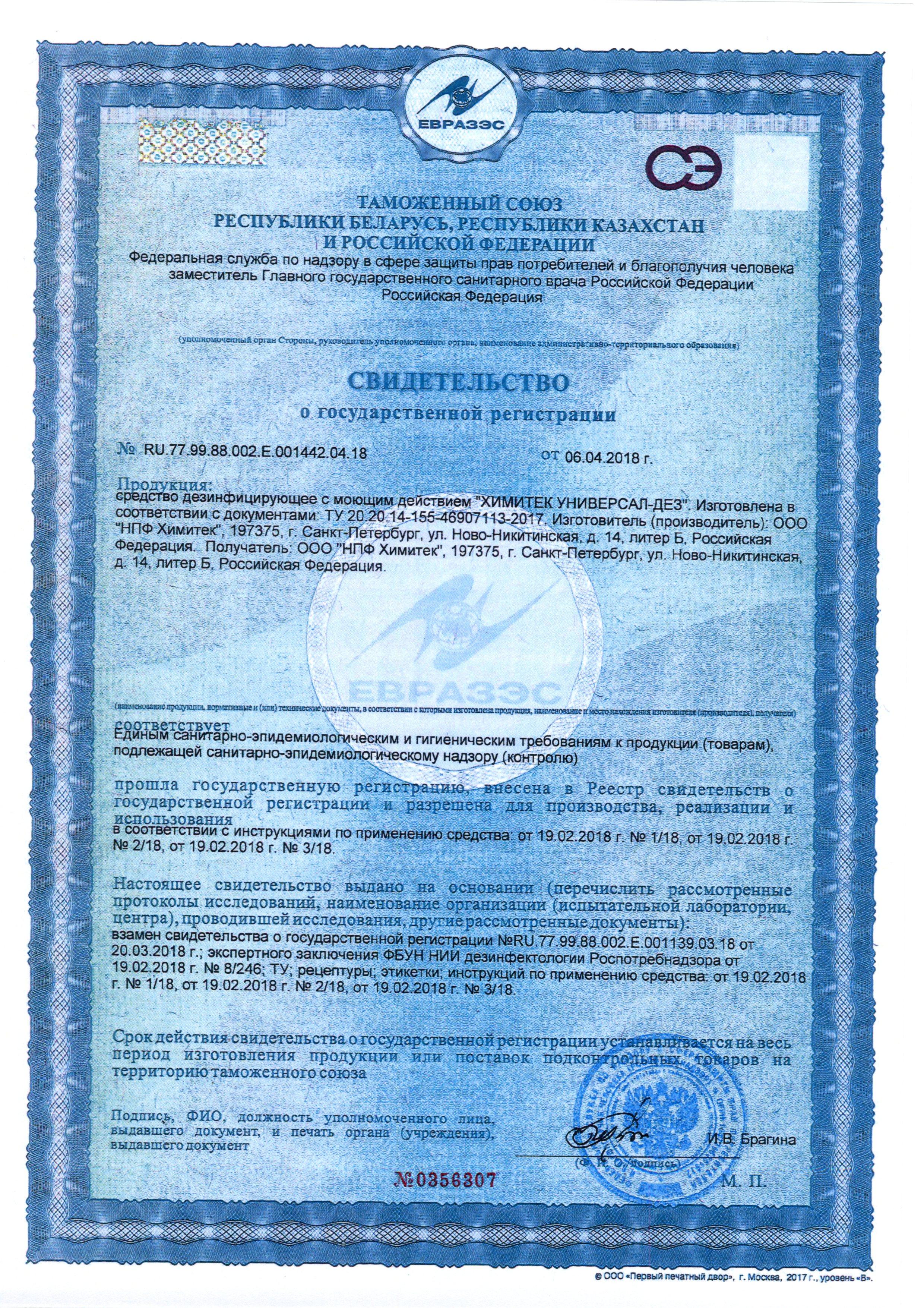 Сертификат на товар - Дезинфицирующее средство с моющим эффектом Химитек Универсал-Дез 5 л (концентрат)