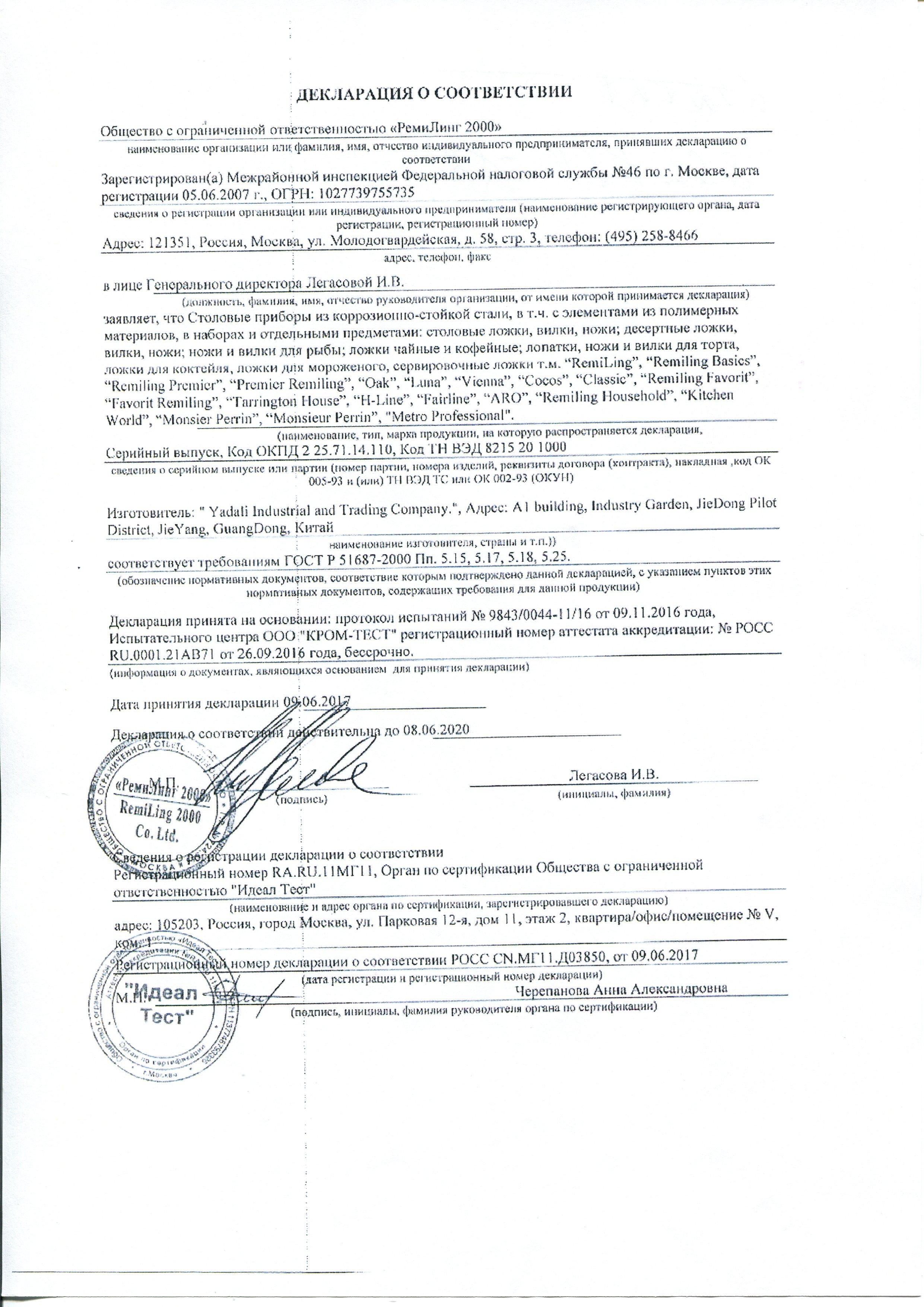 Сертификат на товар - Ложка столовая Remiling Premier 17.5 см 6 штук в упаковке (артикул производителя 63 591)
