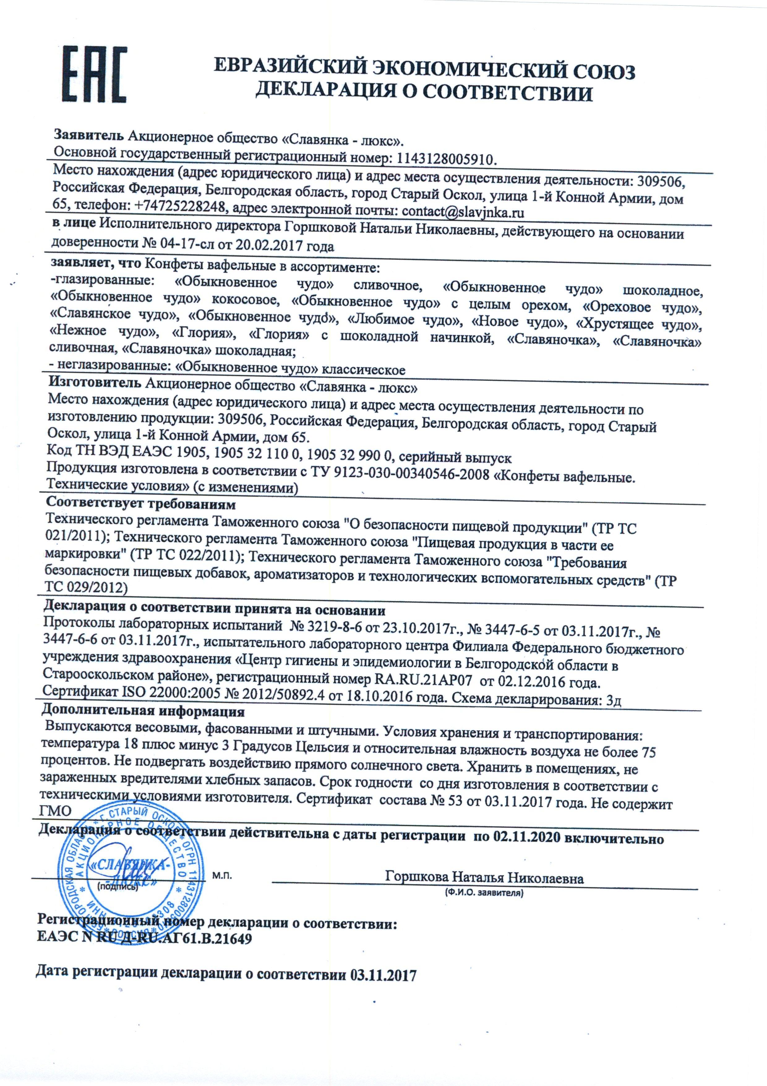 Сертификат на товар - Конфеты шоколадные Славянка Маленькое чудо 1 кг