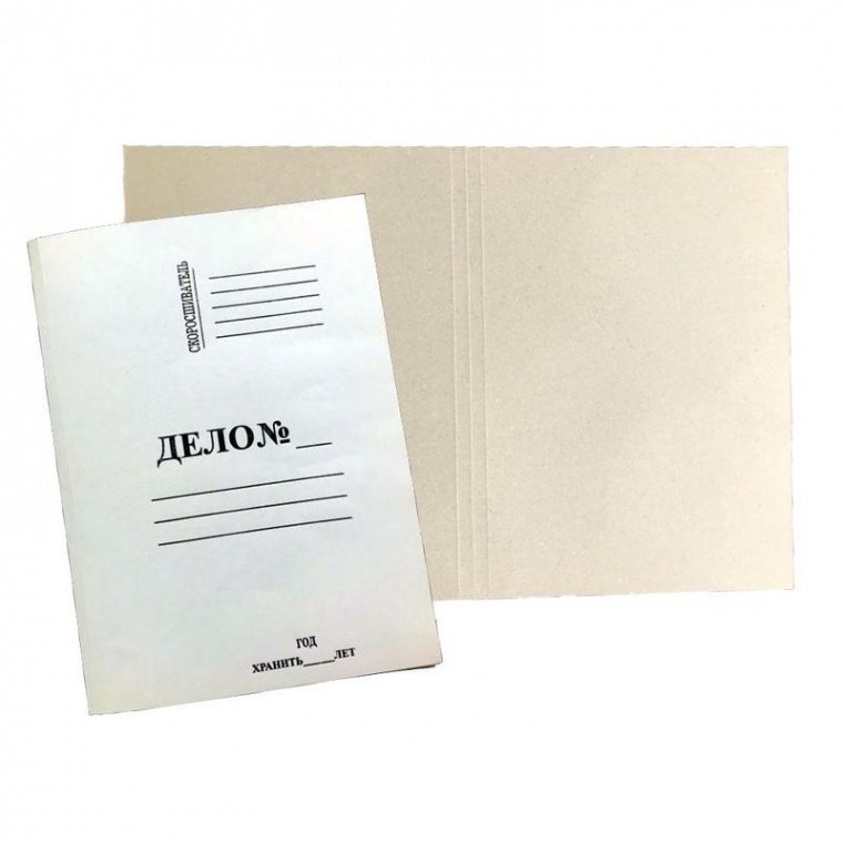 Папка-обложка ’Дело № формата А4 изготовлена из немелованного картона белого цвета плотностью 220 г/кв. м. Без скоросшивателя и завязок. На лицевой стороне есть поля для подписывания