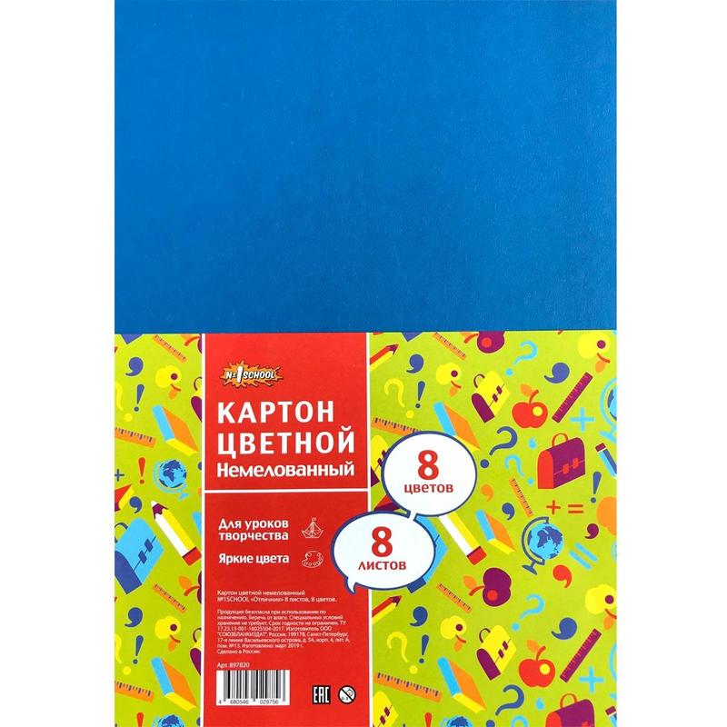 Картон цветной №1 School Отличник (А4, 8 листов, 8 цветов, немелованный)