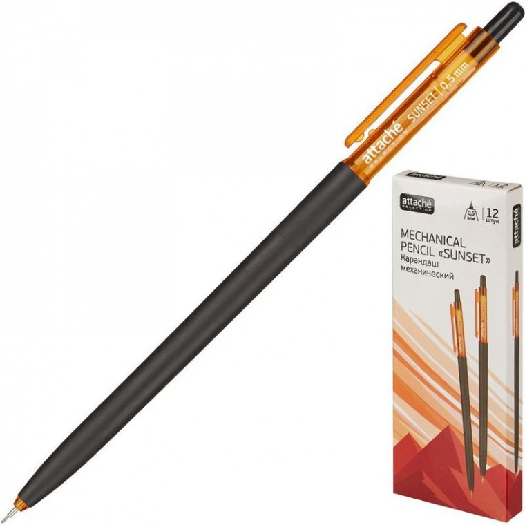 Карандаш механический Attache Selection Sunset с толщиной линии письма 0,5 мм. Выполнен в пластиковом прорезиненном противоскользящем корпусе черно-оранжевого цвета с клипом. Предназначен для рисования, черчения и письма. Отличается точностью и аккуратностью письма.